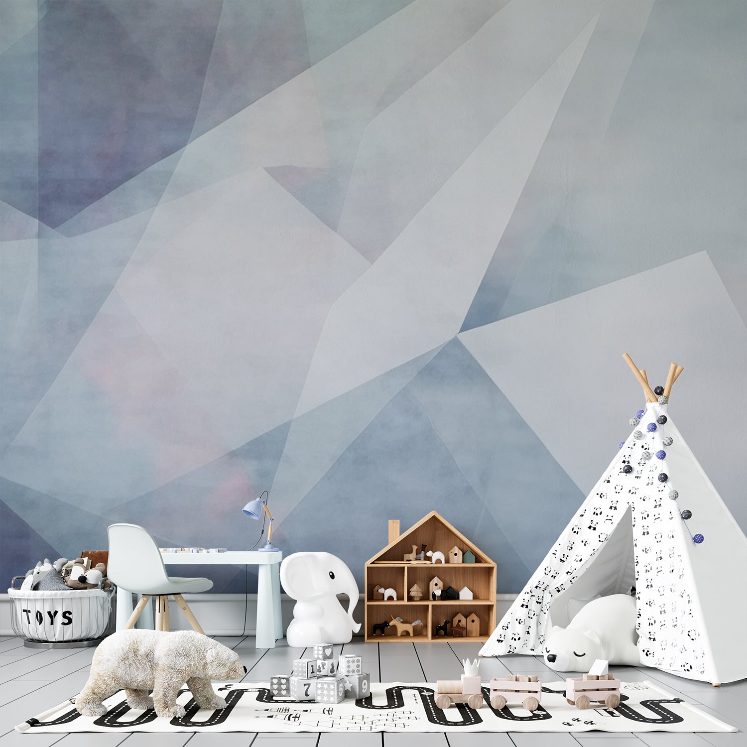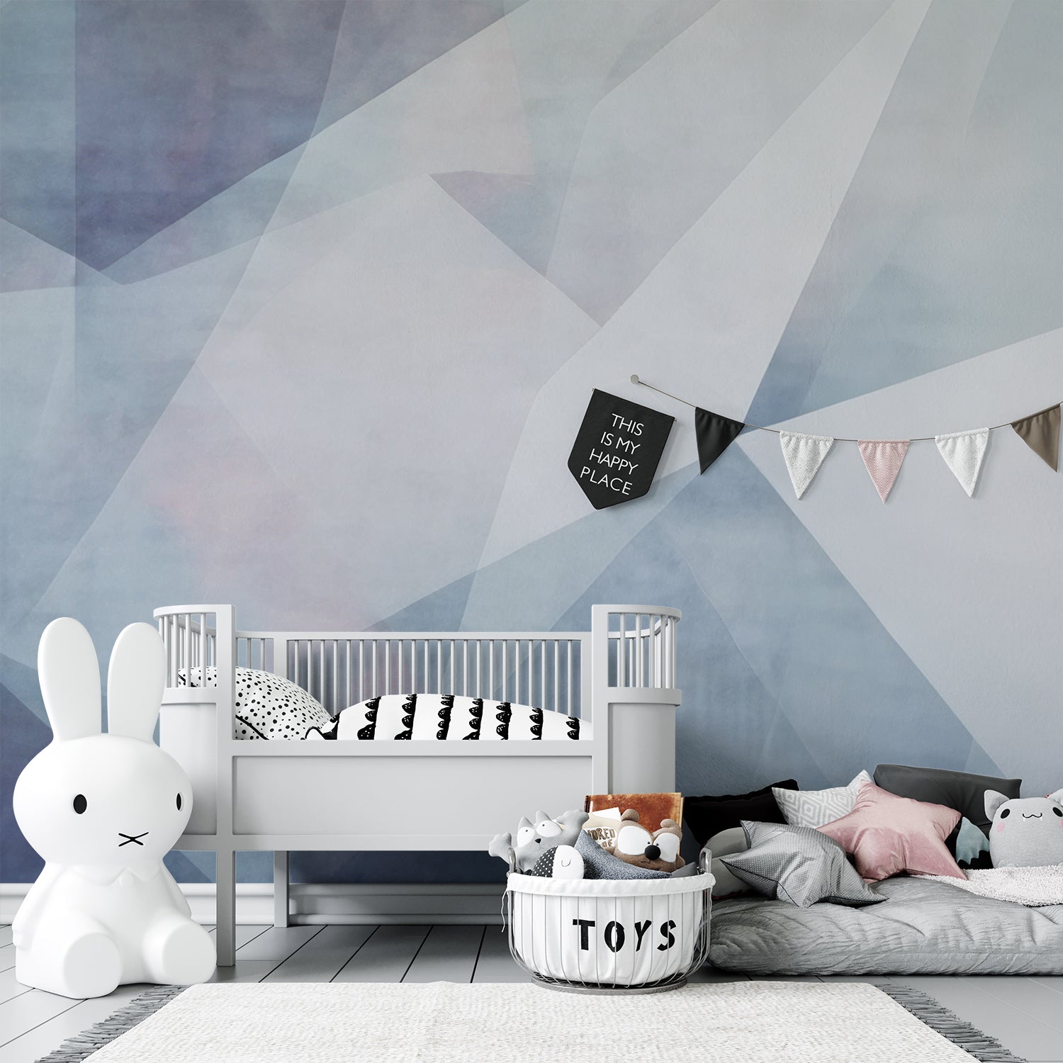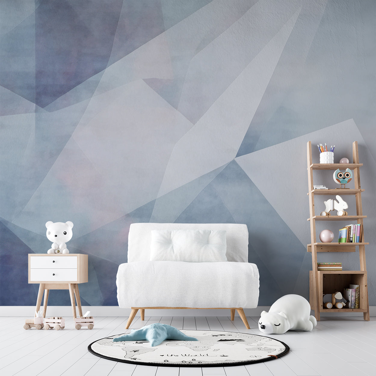 Dit ontwerp combineert abstracte geometrische vormen met zachte, transparante lagen in koele blauwtinten. De subtiele overgangen tussen de vormen creëren een gevoel van diepte en sereniteit, terwijl de zachte kleurverlopen een kalmerende atmosfeer uitstralen. Het geheel doet denken aan mistige kristallen of bevroren landschappen, perfect voor een moderne en minimalistische inrichting.