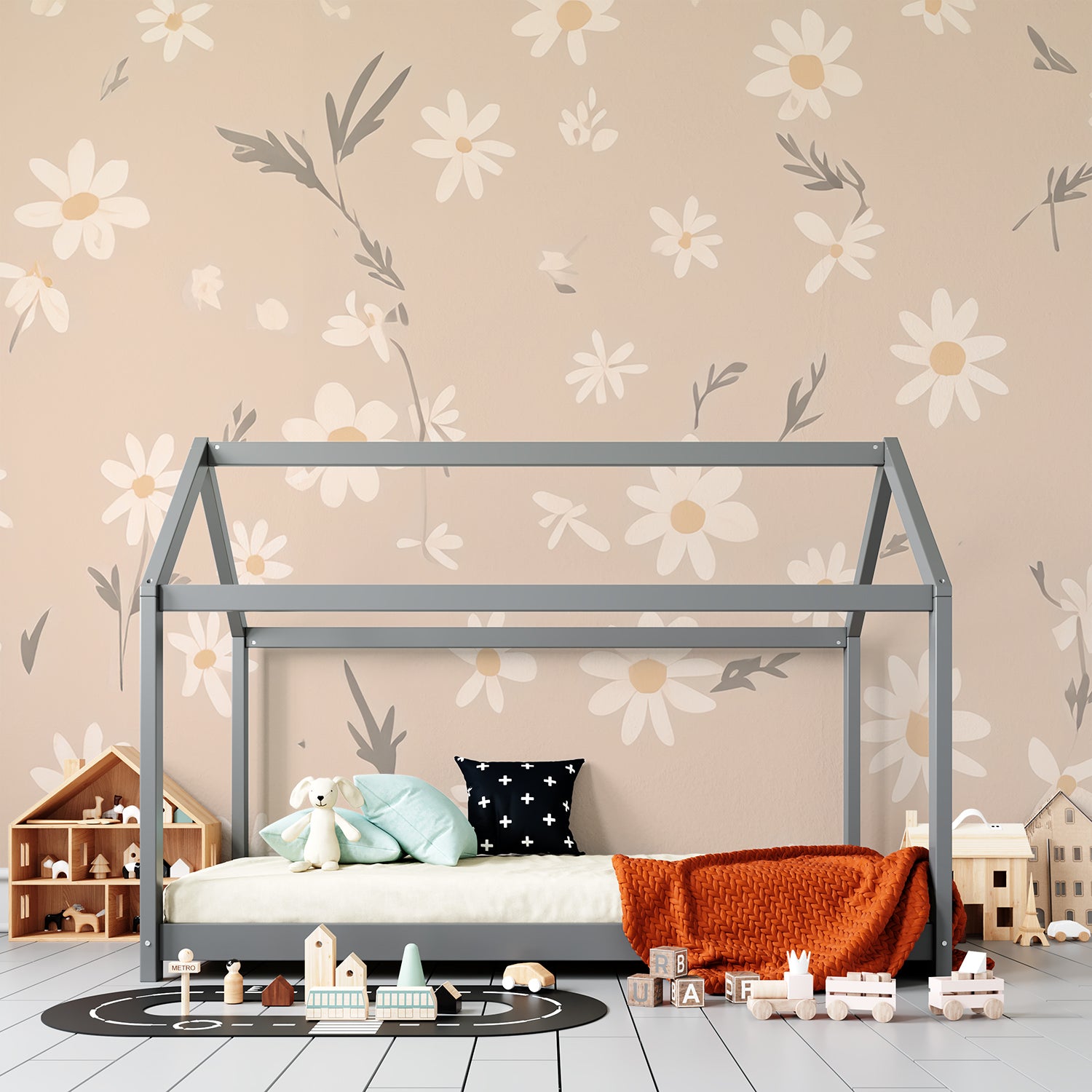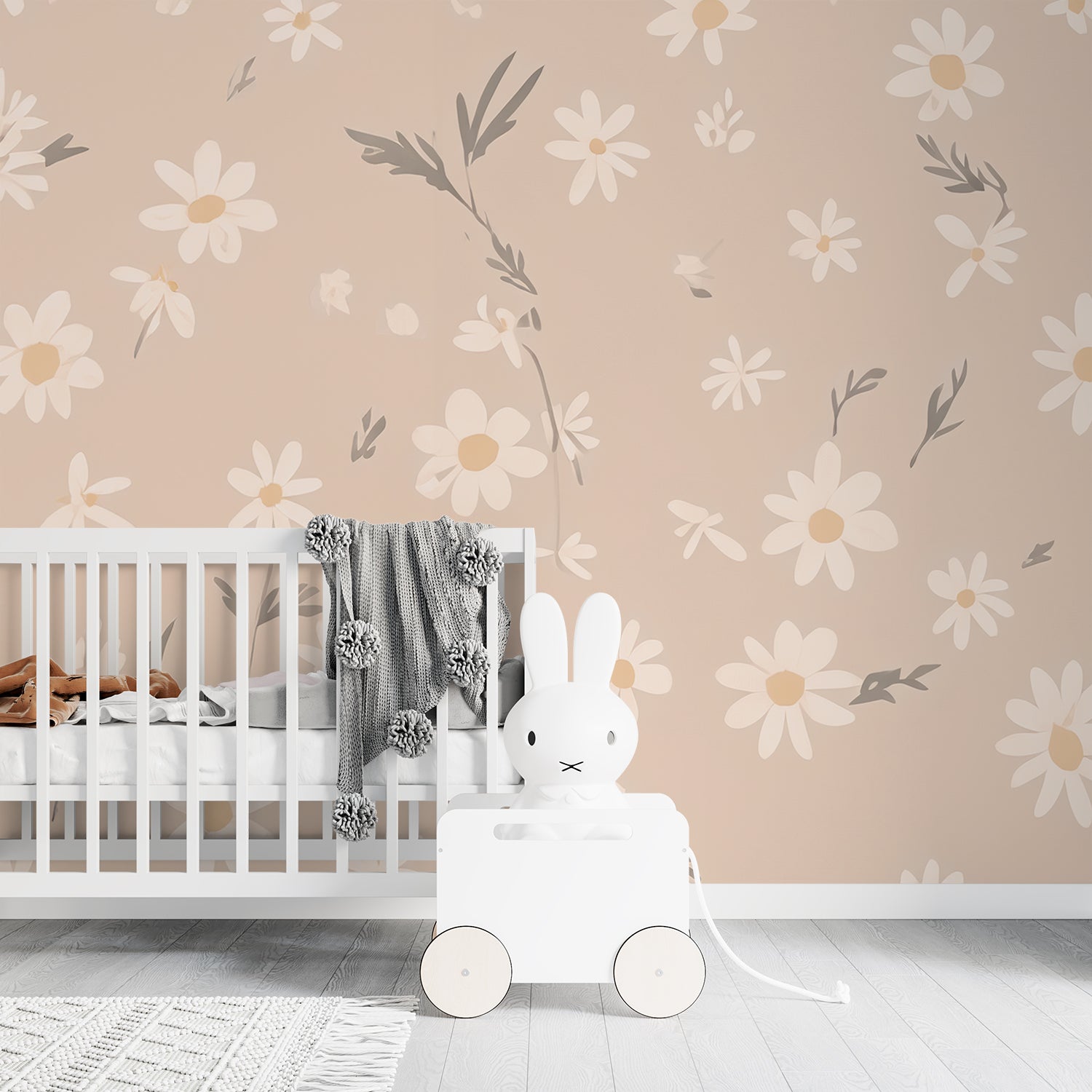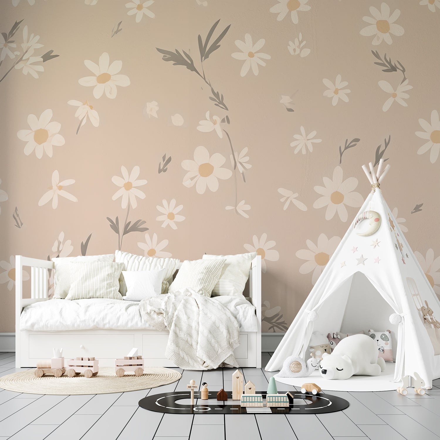 Een elegant en luchtig ontwerp van delicate madeliefjes op een zachte beige achtergrond. De minimalistische bloemen en subtiele groene accenten brengen een gevoel van rust en eenvoud in de ruimte. Dit tijdloze patroon combineert natuur met een zachte, moderne stijl, perfect om een speelse maar serene sfeer te creëren.