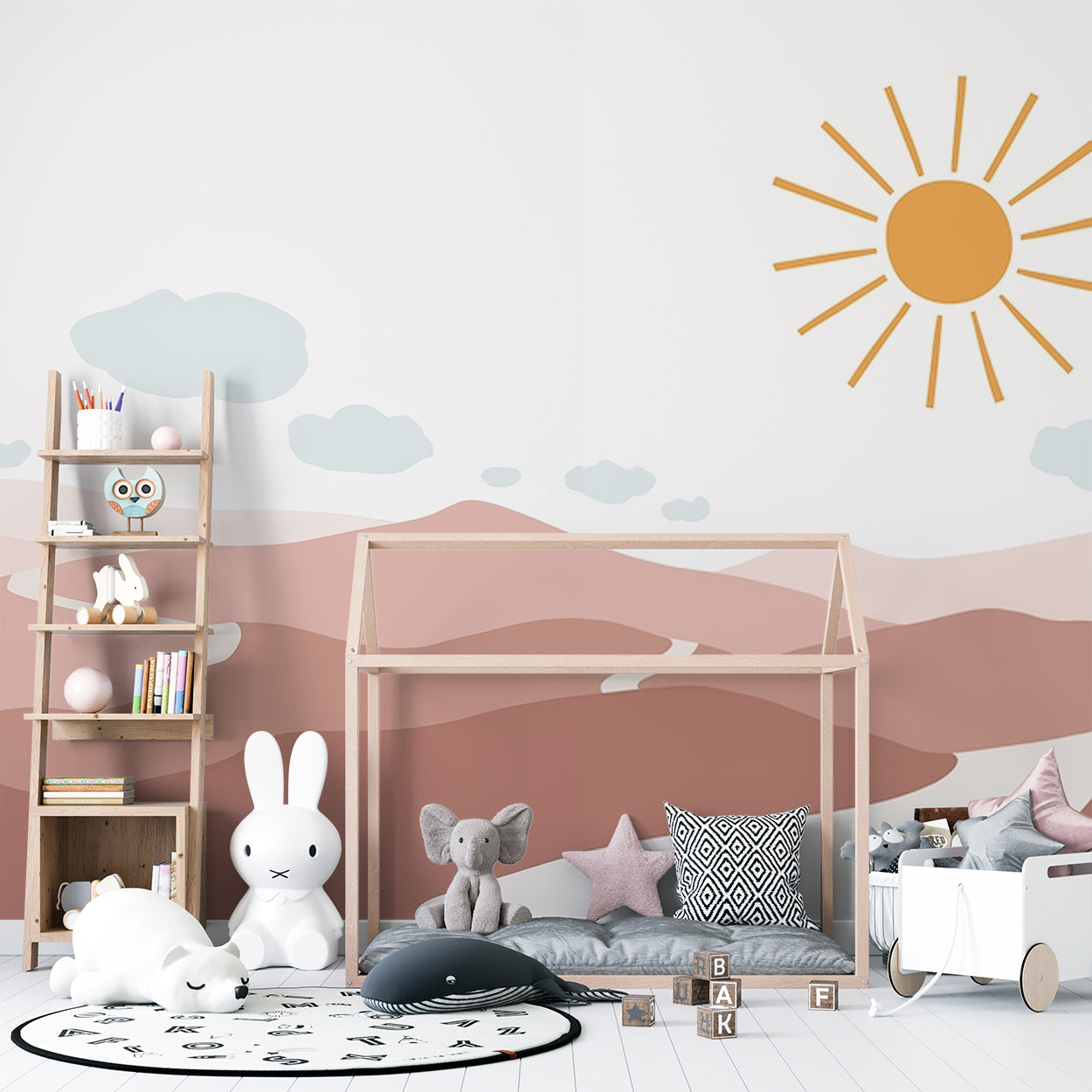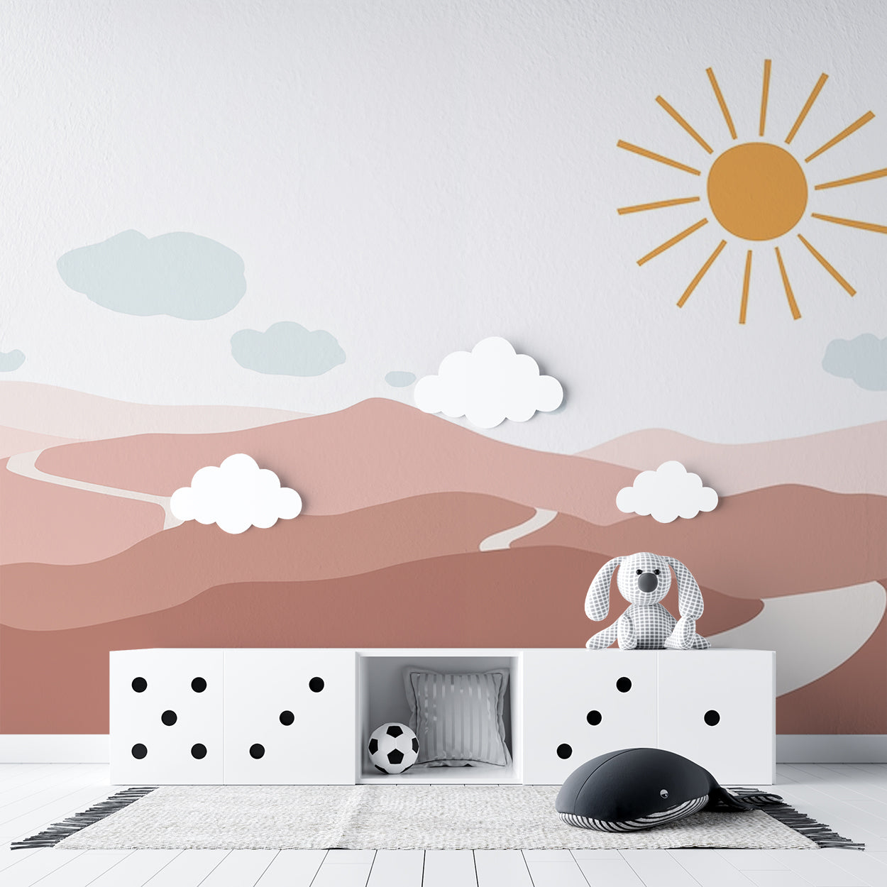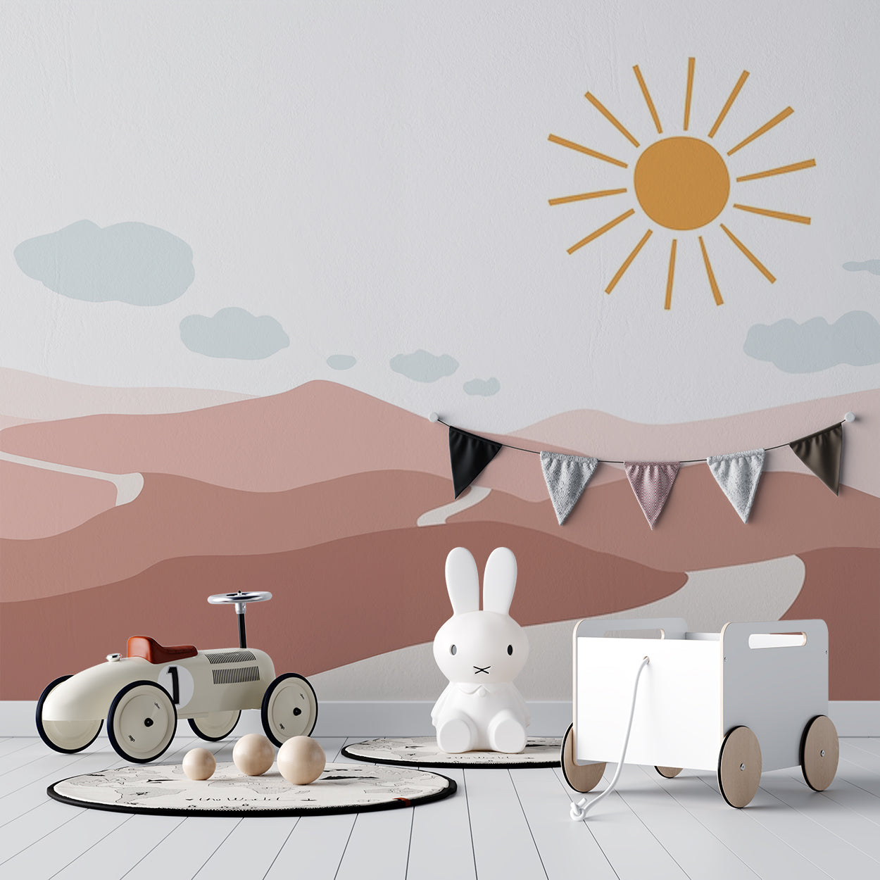 Dit minimalistische ontwerp straalt rust en warmte uit met zachte zandtinten en vloeiende lijnen die de heuvelachtige woestijnlandschap vormen. De eenvoudige zon met stralen in een warme, gouden tint voegt een gevoel van sereniteit toe, terwijl de lichte wolken een luchtige sfeer creëren. Perfect voor het creëren van een ontspannen en uitnodigende omgeving, waar het design subtiel en toch krachtig spreekt.