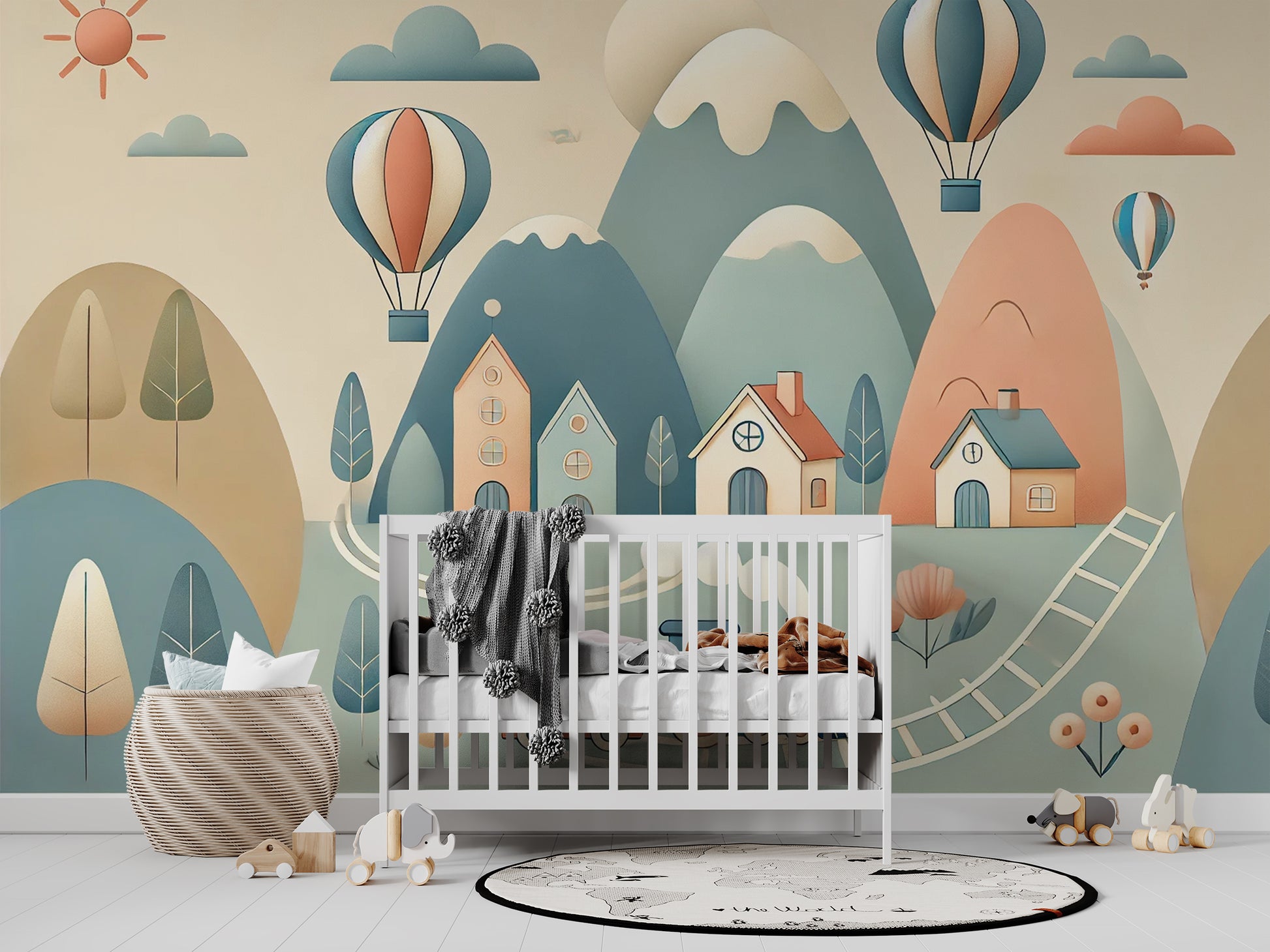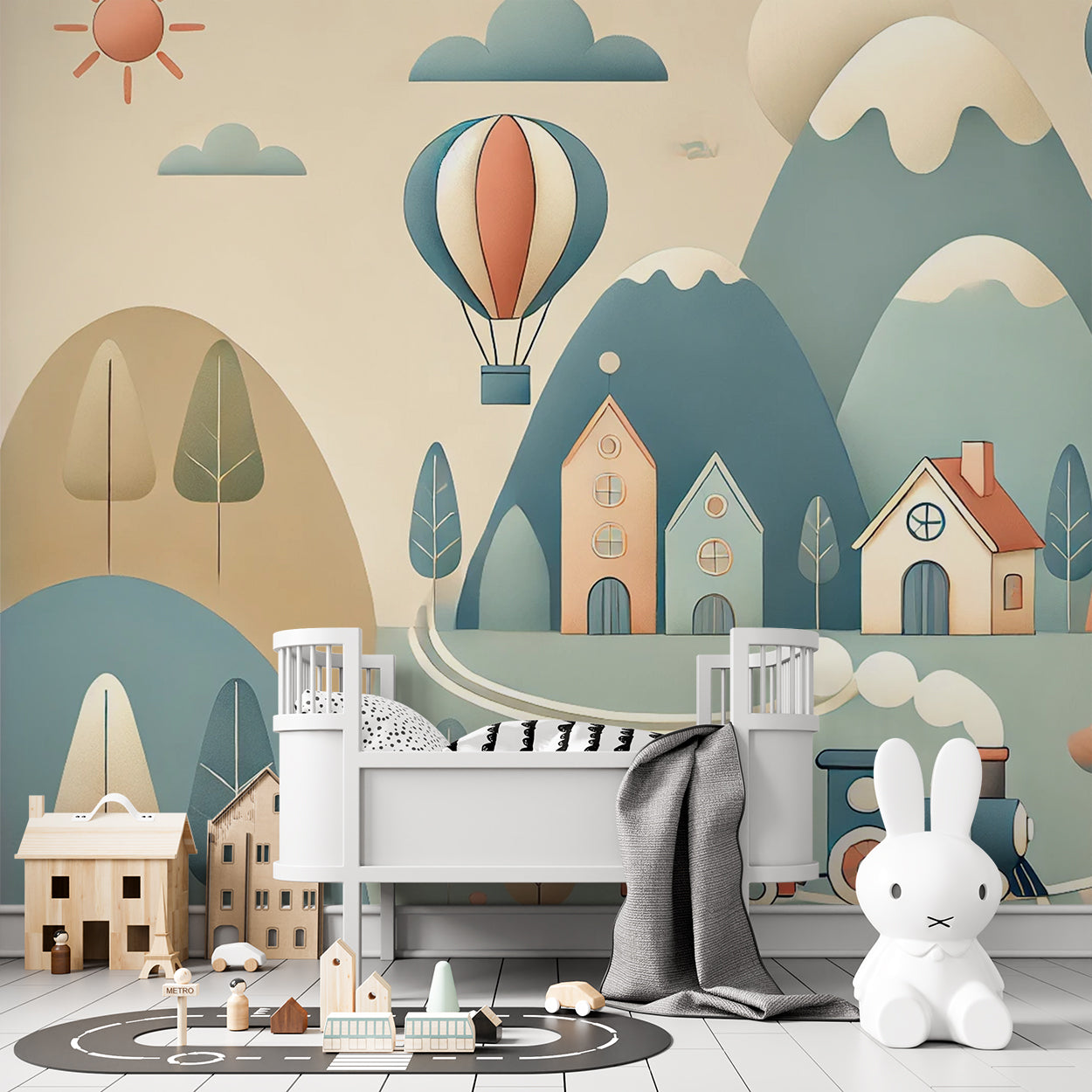 In deze vrolijke illustratie slingert een speels treintje door een idyllisch berglandschap, omringd door schattige huisjes en luchtige luchtballonnen. De zachte pastelkleuren in blauw, beige en roze brengen een kalme, dromerige sfeer. Perfect voor een kinderkamer, dit ontwerp straalt avontuur en rust uit, met aandacht voor leuke details zoals de zwevende ballonnen en gezellige huizen.