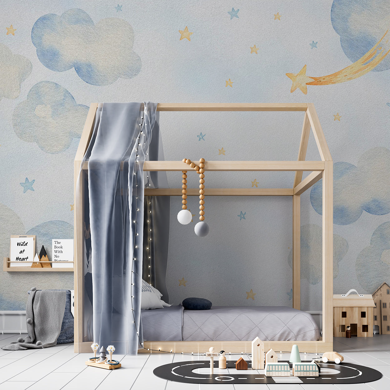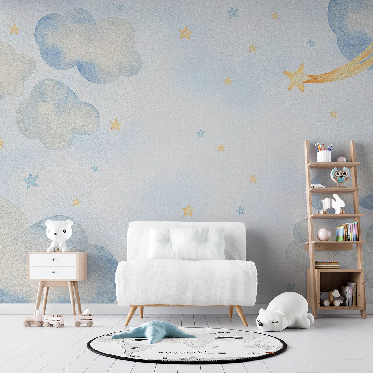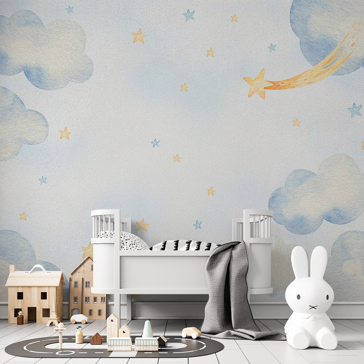 Dit dromerige ontwerp straalt een zachte, rustgevende sfeer uit met subtiele waterverfachtige wolken en sterren in pasteltinten. De vallende ster voegt een speels element toe en maakt dit ontwerp perfect voor een kalmerende, fantasierijke kinderkamer. De luchtige compositie en de vriendelijke kleuren creëren een serene en ontspannen omgeving, ideaal om weg te dromen onder een hemelse sterrennacht.