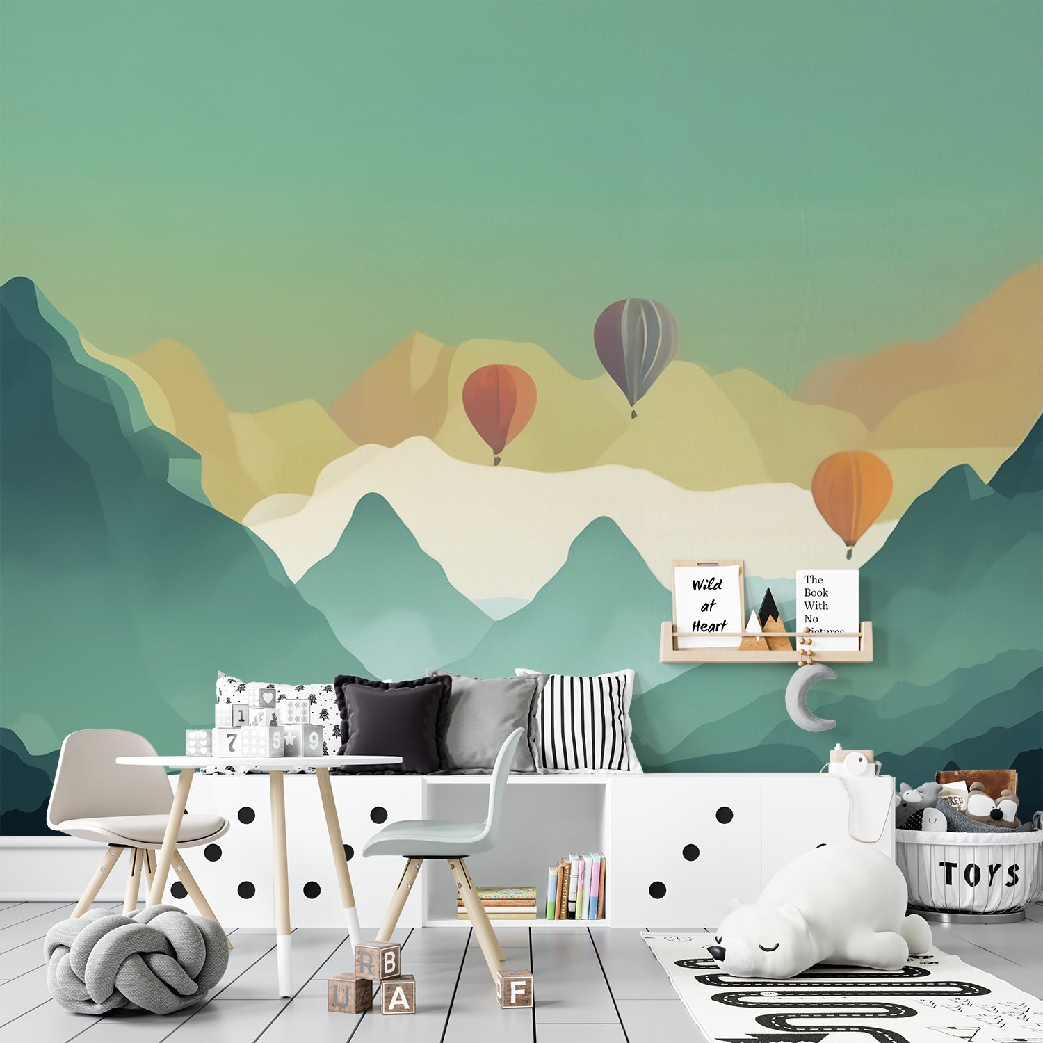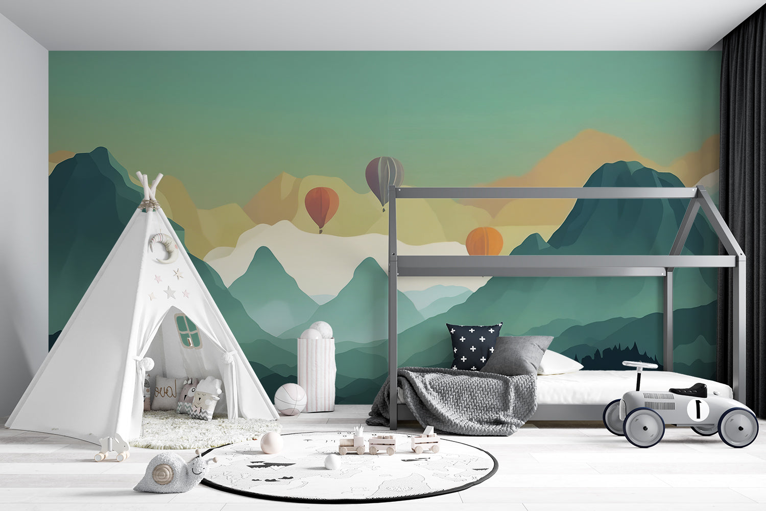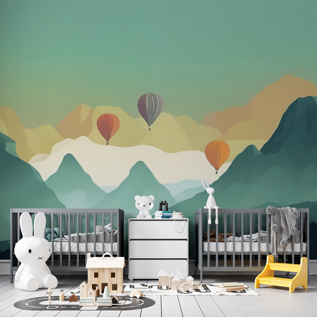 Dit serene ontwerp vangt de rust van een berglandschap bij zonsopgang, met warme tinten die geleidelijk overgaan van zachte gele en oranje tonen naar koelere groenen en blauwen. De luchtballonnen die vredig zweven boven de mistige bergtoppen voegen een vleugje avontuur en vrijheid toe. De gelaagdheid van de bergen creëert diepte en dimensie, waardoor een harmonieuze balans tussen kalmte en levendigheid ontstaat in dit verfijnde ontwerp.