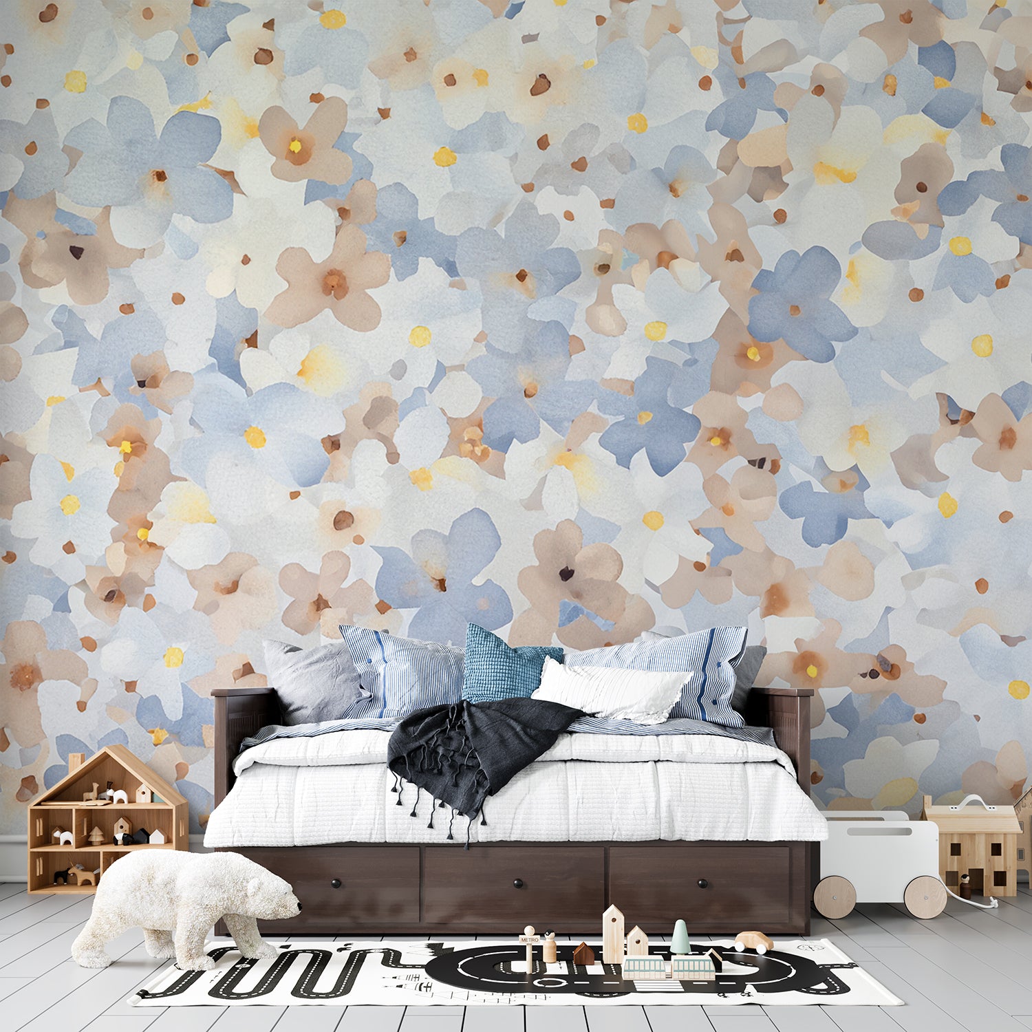 Dit ontwerp straalt een zachte, dromerige sfeer uit met zijn delicaat geschilderde bloemen in pastelblauwe, beige en crèmekleuren. De lichte penseelstreken creëren een luchtige en serene uitstraling, waardoor de ruimte een gevoel van rust en elegantie krijgt. De subtiele, speelse verspreiding van bloemblaadjes voegt een vrolijk en toch verfijnd detail toe aan het geheel. Perfect voor een frisse, ontspannen ambiance.