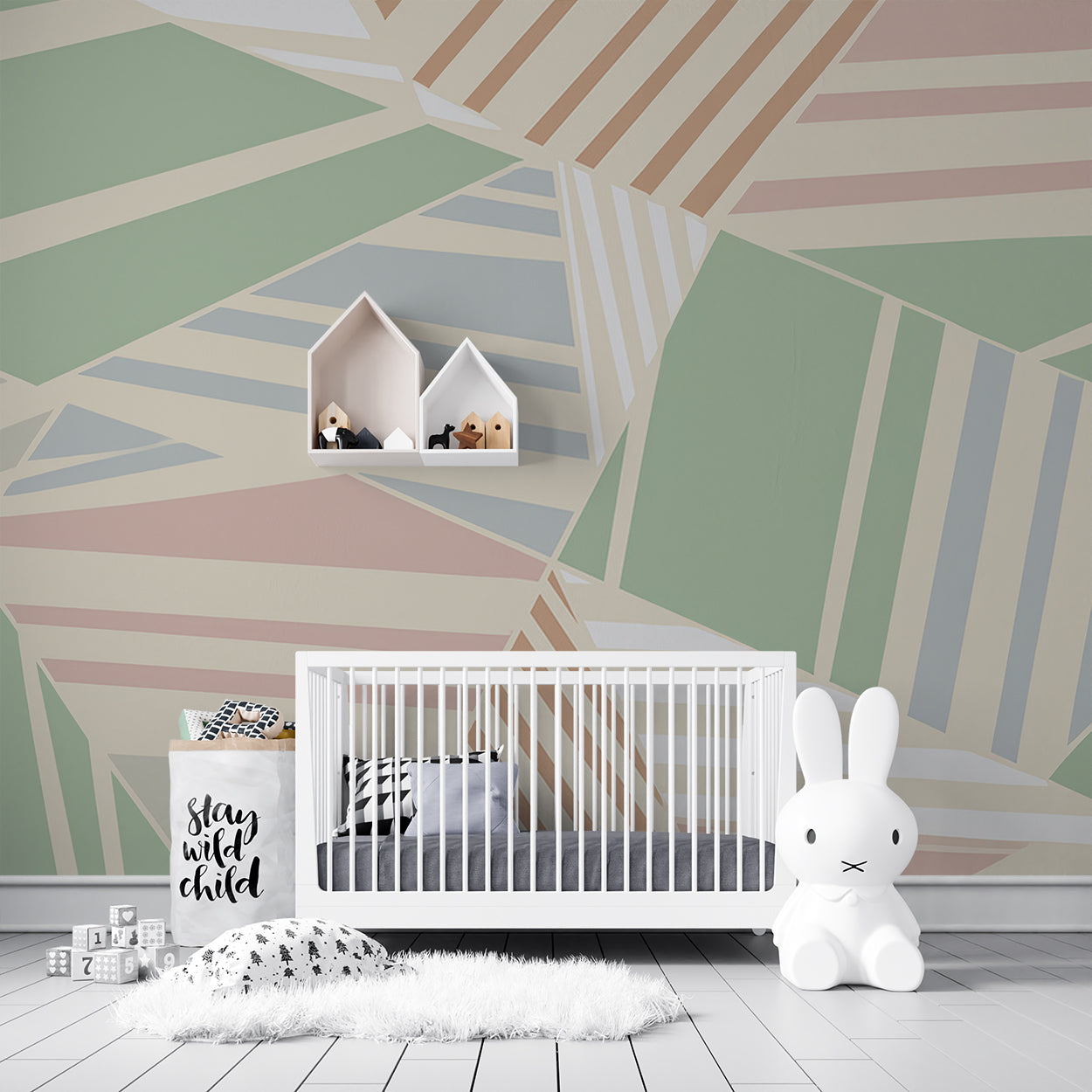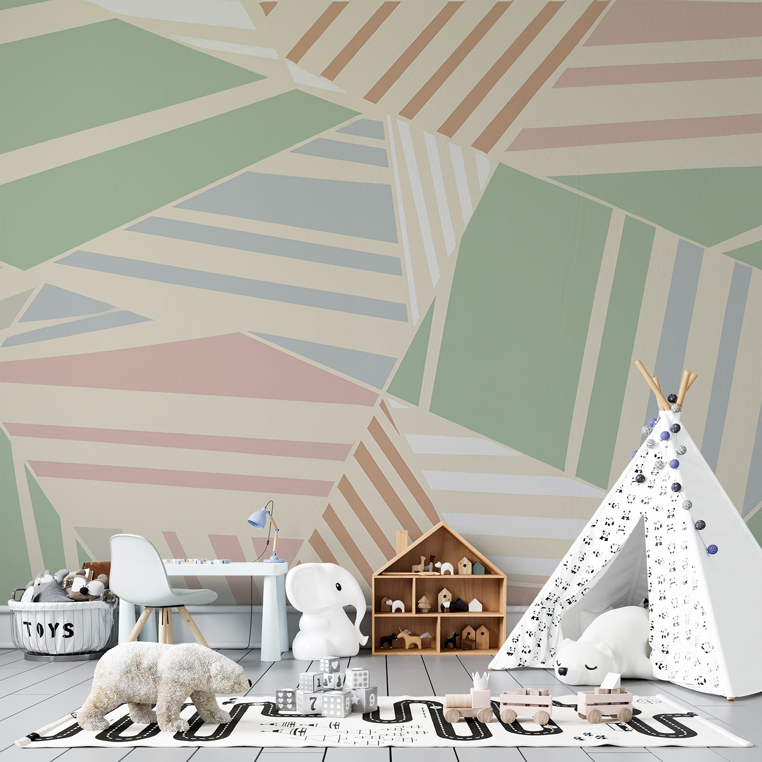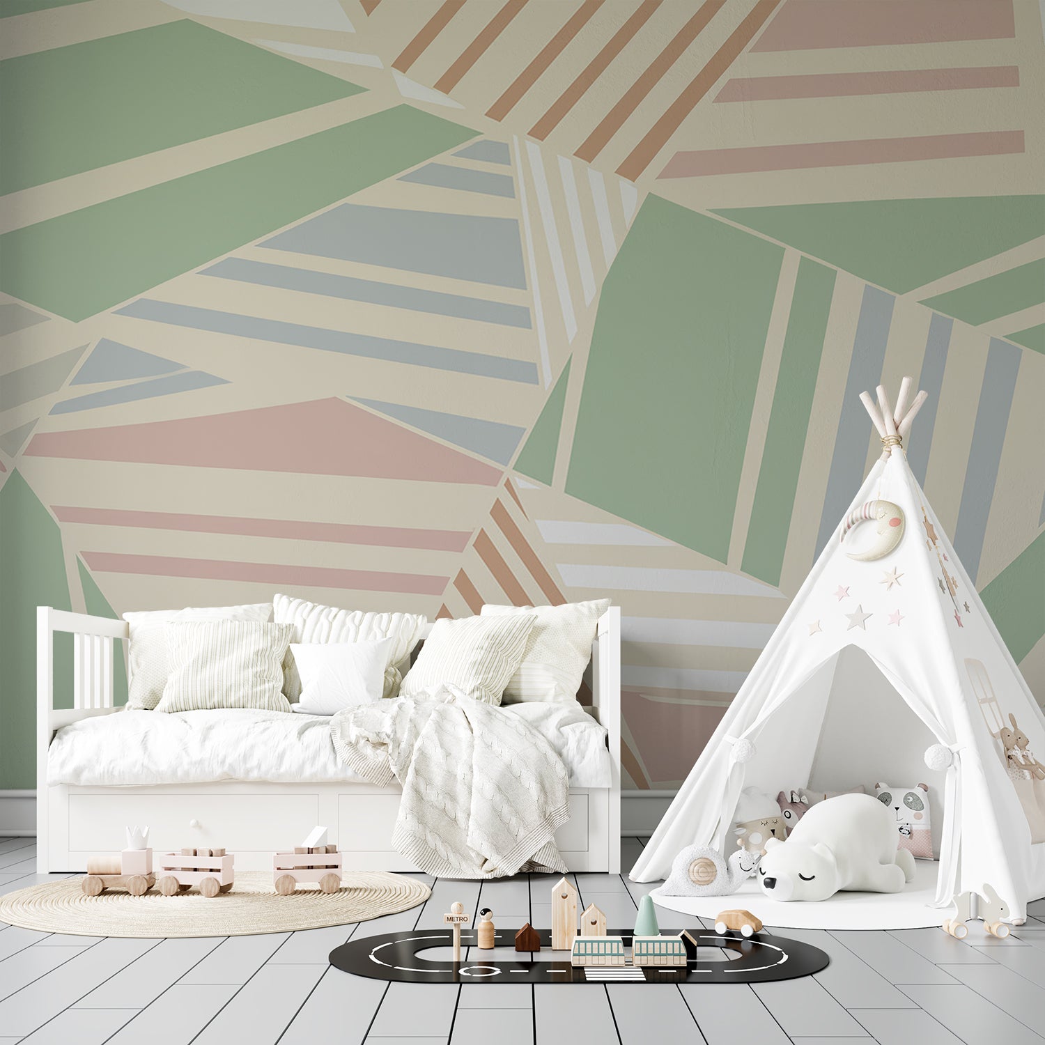Dit geometrische ontwerp combineert subtiele pastelkleuren met dynamische, diagonale lijnen en vormen. De afwisselende patronen creëren een moderne en speelse uitstraling die zowel energie als balans uitstraalt. Perfect voor een eigentijdse en artistieke inrichting waarbij kleur en structuur op subtiele wijze samensmelten.