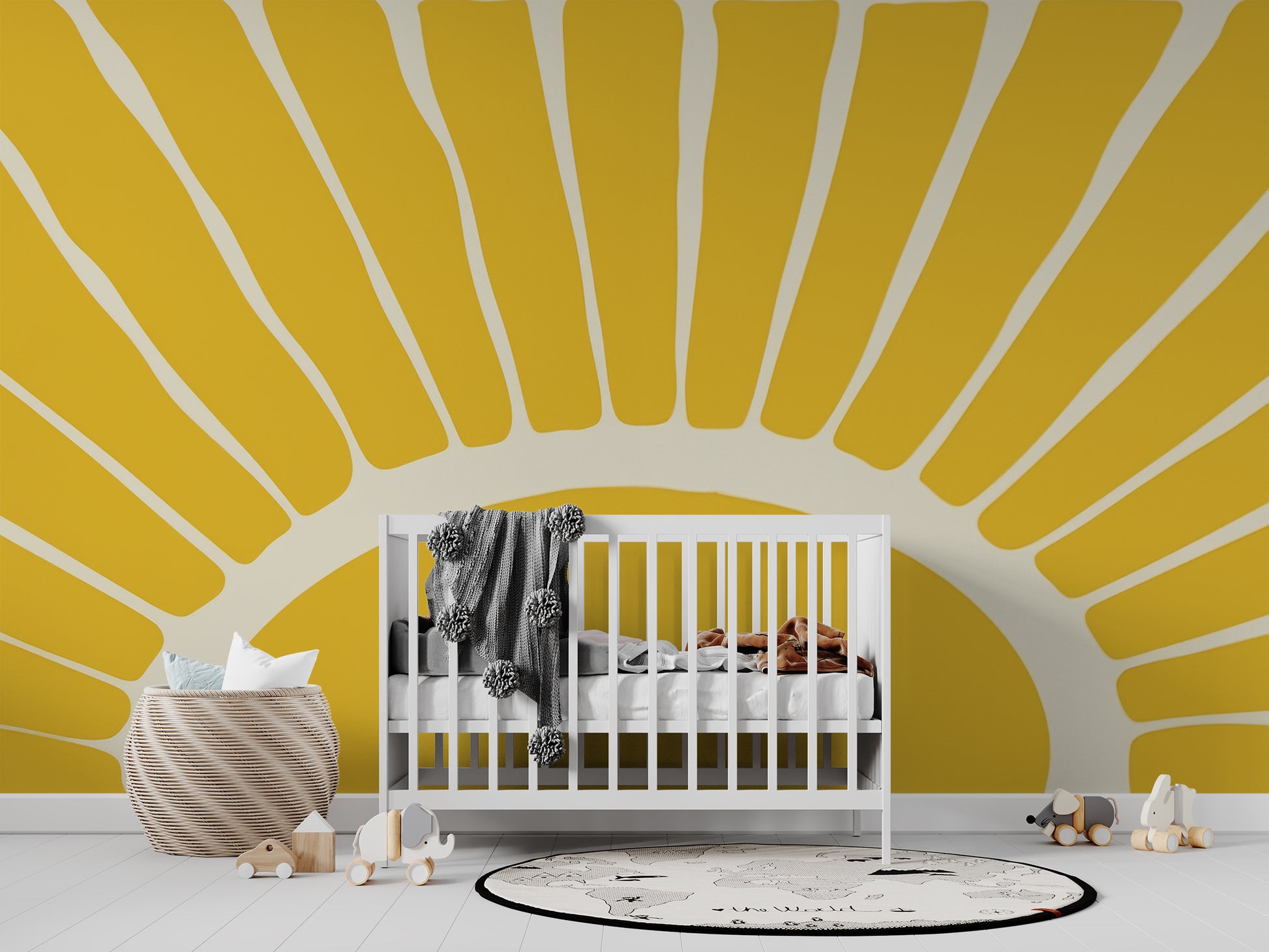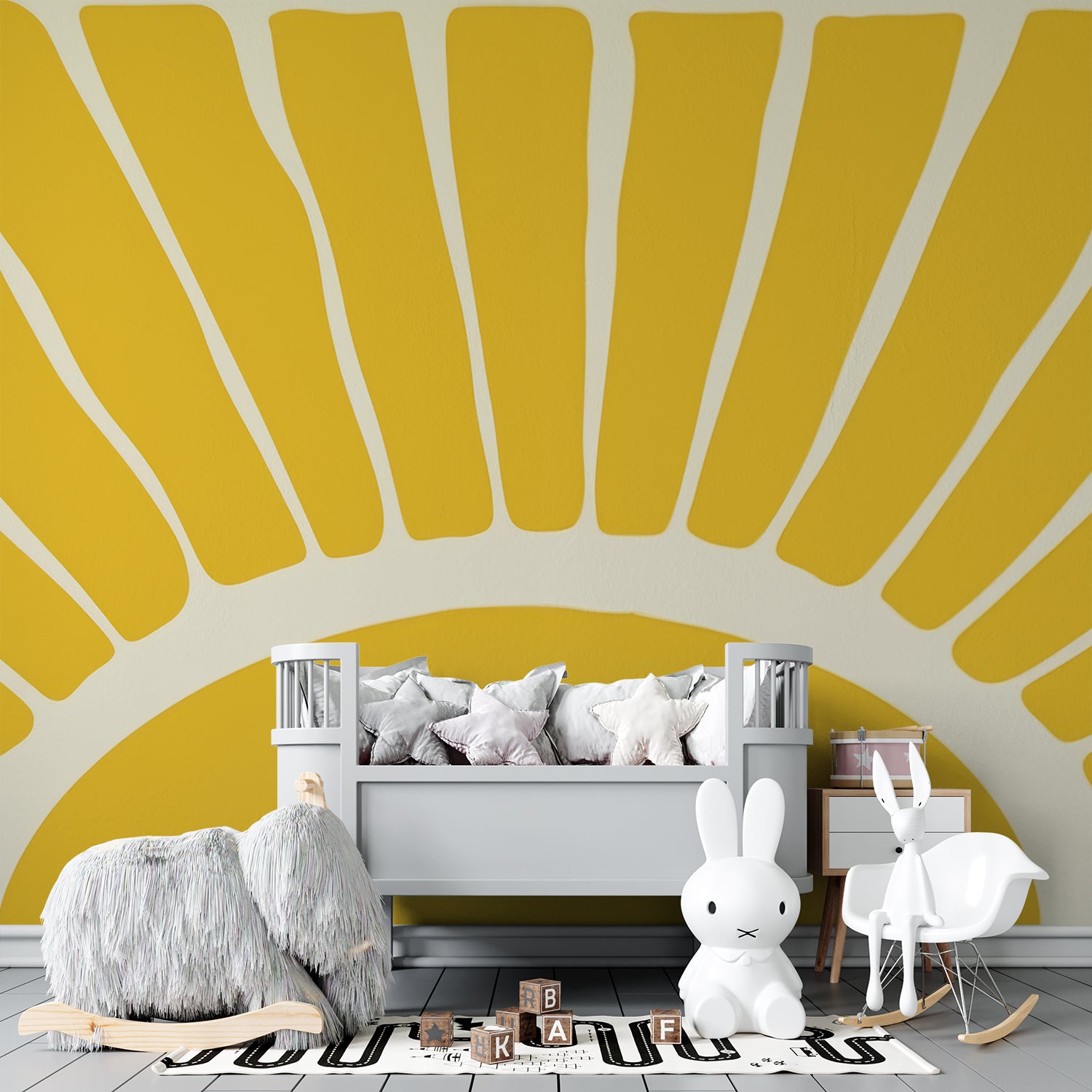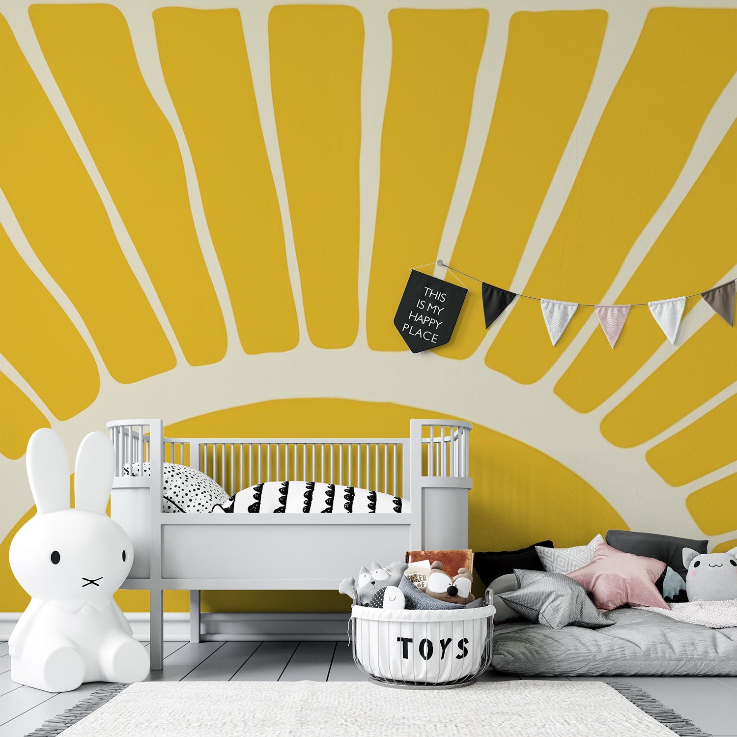 Dit opvallende ontwerp vangt de essentie van een stralende zonsopgang met zijn minimalistische, geometrische zonnestralen in warme gele tinten. De strakke lijnen en het krachtige kleurgebruik brengen een energieke, optimistische sfeer in de ruimte. Ideaal voor een levendig accent dat positiviteit en warmte uitstraalt in elke omgeving.