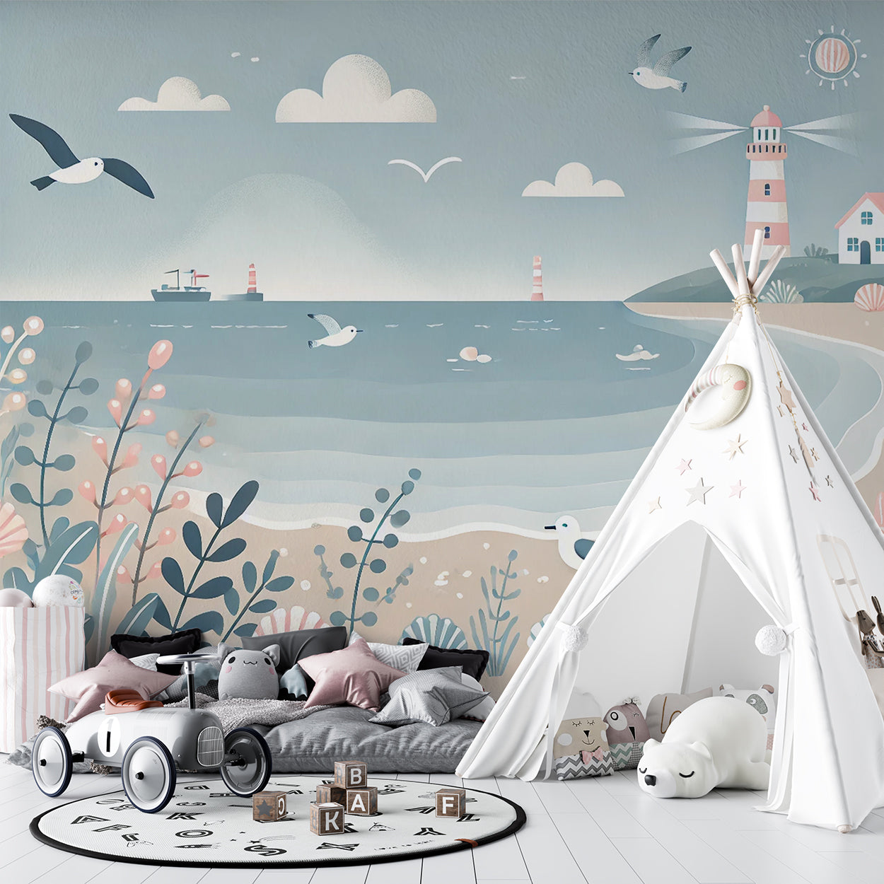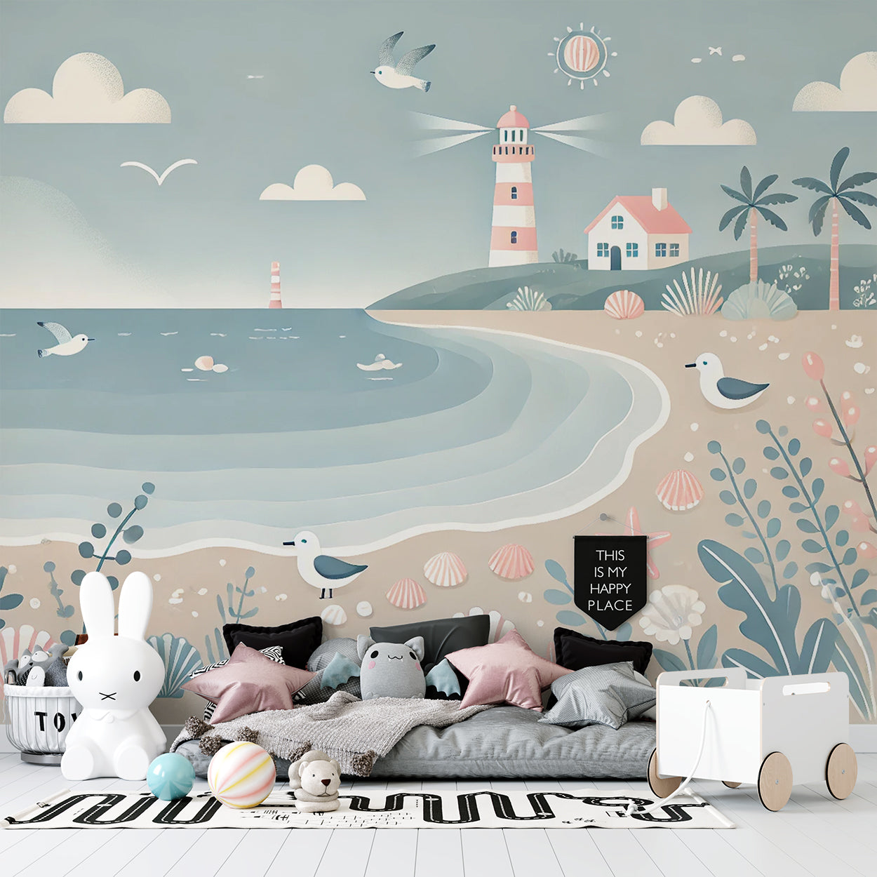 Dit serene ontwerp vangt de rust van een dag aan het strand met zachte pastelkleuren. Het landschap is een uitnodiging tot ontspanning, met een schilderachtige vuurtoren op de achtergrond, golven die zachtjes tegen de kust rollen, en speelse details zoals schelpen, zeemeeuwen en een bloemenzee. Het harmonieuze kleurgebruik en de eenvoudige vormen creëren een gevoel van balans, perfect voor het inrichten van een kindvriendelijke en kalmerende ruimte.