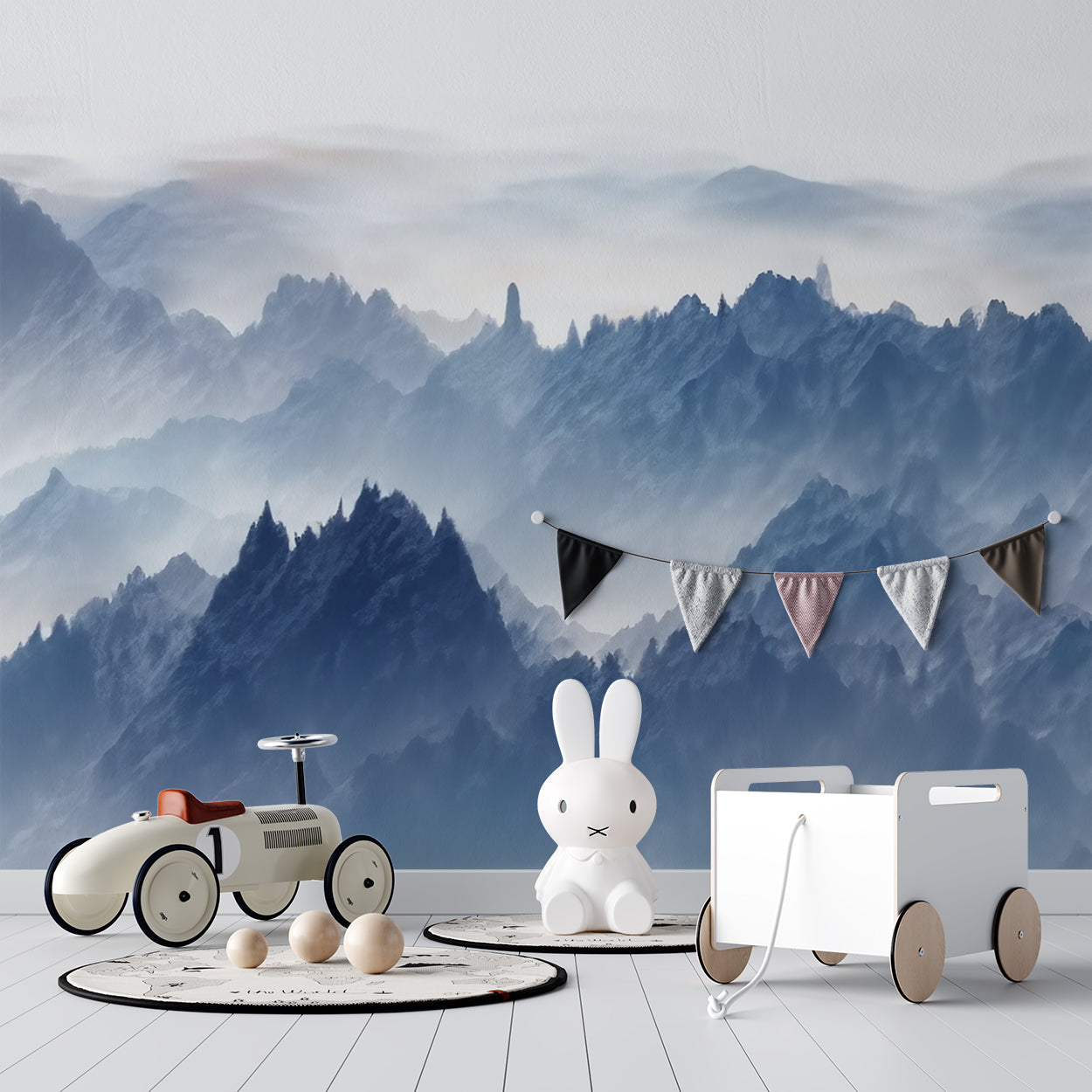 Dit adembenemende ontwerp vangt de magie van mysterieuze bergtoppen gehuld in een zee van mist. De verschillende lagen van blauwgrijze tinten zorgen voor een serene diepte en een gevoel van rust. Het spel van licht en schaduw geeft een dynamisch effect aan het landschap, terwijl de zachte overgangen een dromerige sfeer creëren. Perfect voor wie een gevoel van grootsheid en kalmte in de ruimte wil brengen.