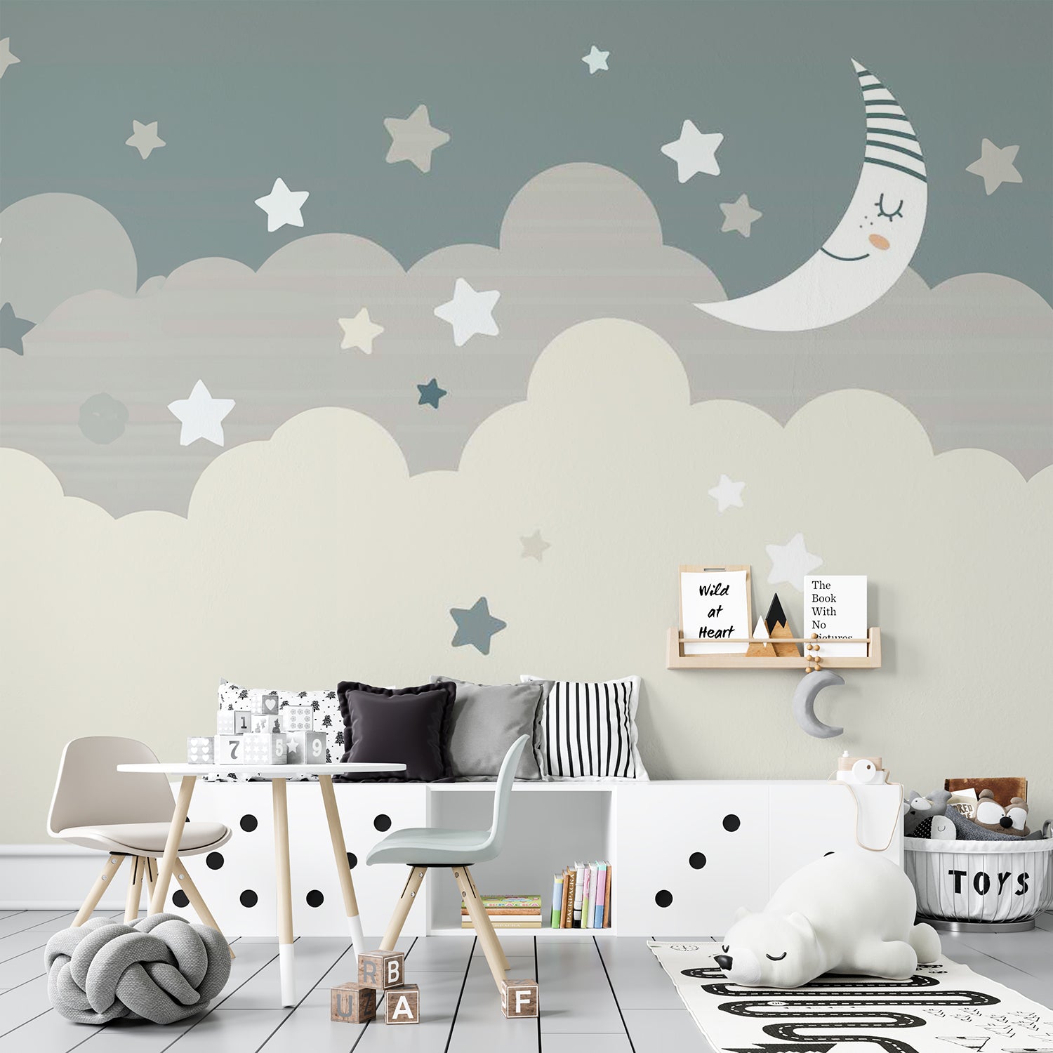 Dit dromerige ontwerp in zachte pasteltinten creëert een serene sfeer, perfect voor een rustgevende kinderkamer. De slapende maan en de zwevende sterren boven de pluizige wolken geven een gevoel van kalmte en veiligheid. Het minimalistische ontwerp en de harmonieuze kleuren dragen bij aan een ontspannen en magische omgeving waar kinderen zich veilig en geborgen voelen. Ideaal voor een betoverend en rustig interieur.