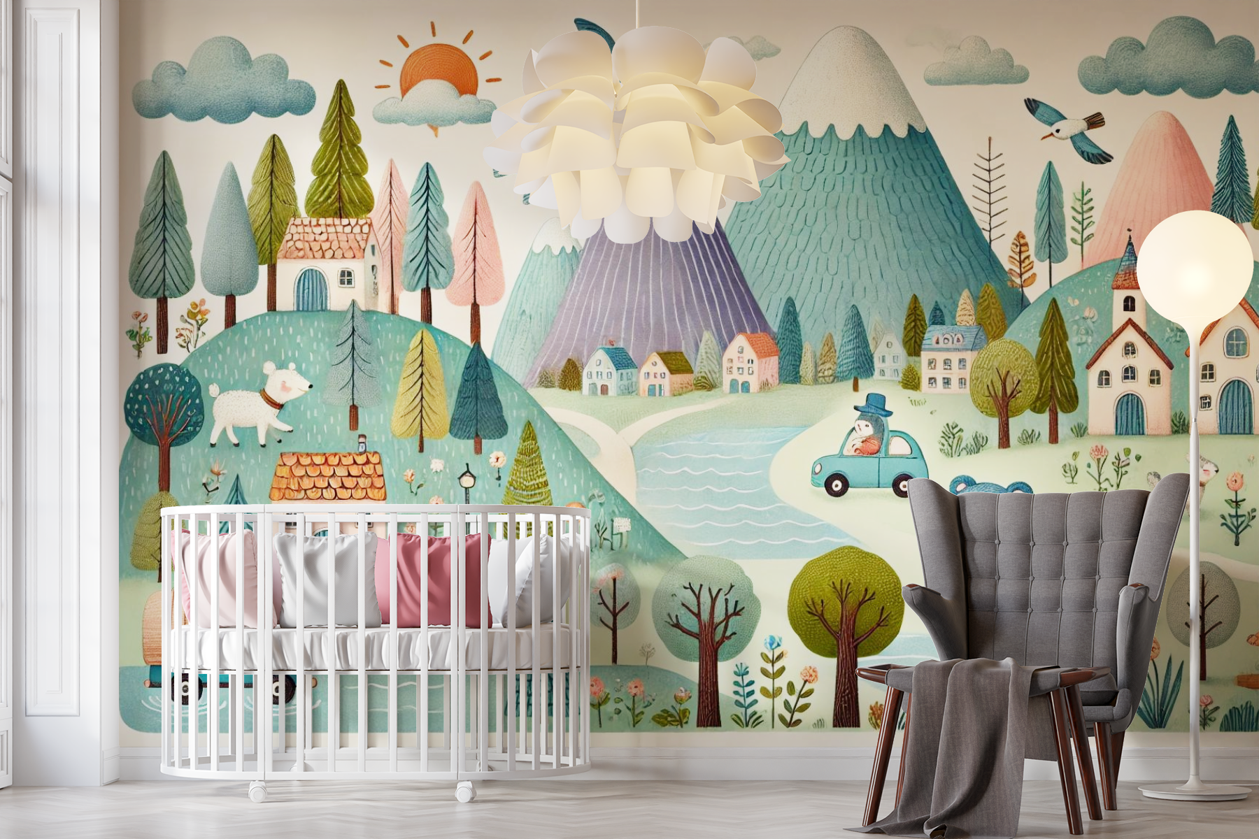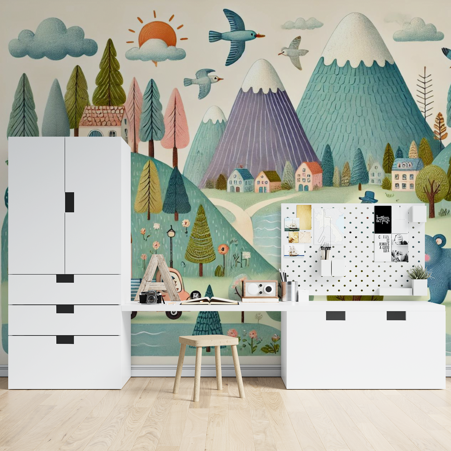 Ontdek de charme van "Mountain Meadow". Dit kunstwerk toont een levendig dorp gelegen tussen majestueuze bergen en weelderige bossen, met schattige huisjes en speelse dieren zoals beren, schapen en vogels. De serene en vrolijke illustraties in zachte kleuren brengen een gevoel van rust en vreugde in elke ruimte. Perfect voor kinderkamers of elke plek die een speelse en betoverende touch nodig heeft. Geprint op hoogwaardig fotobehang, is dit kunstwerk klaar om aan de muur te hangen en een glimlach op het gezicht van iedereen te toveren.
