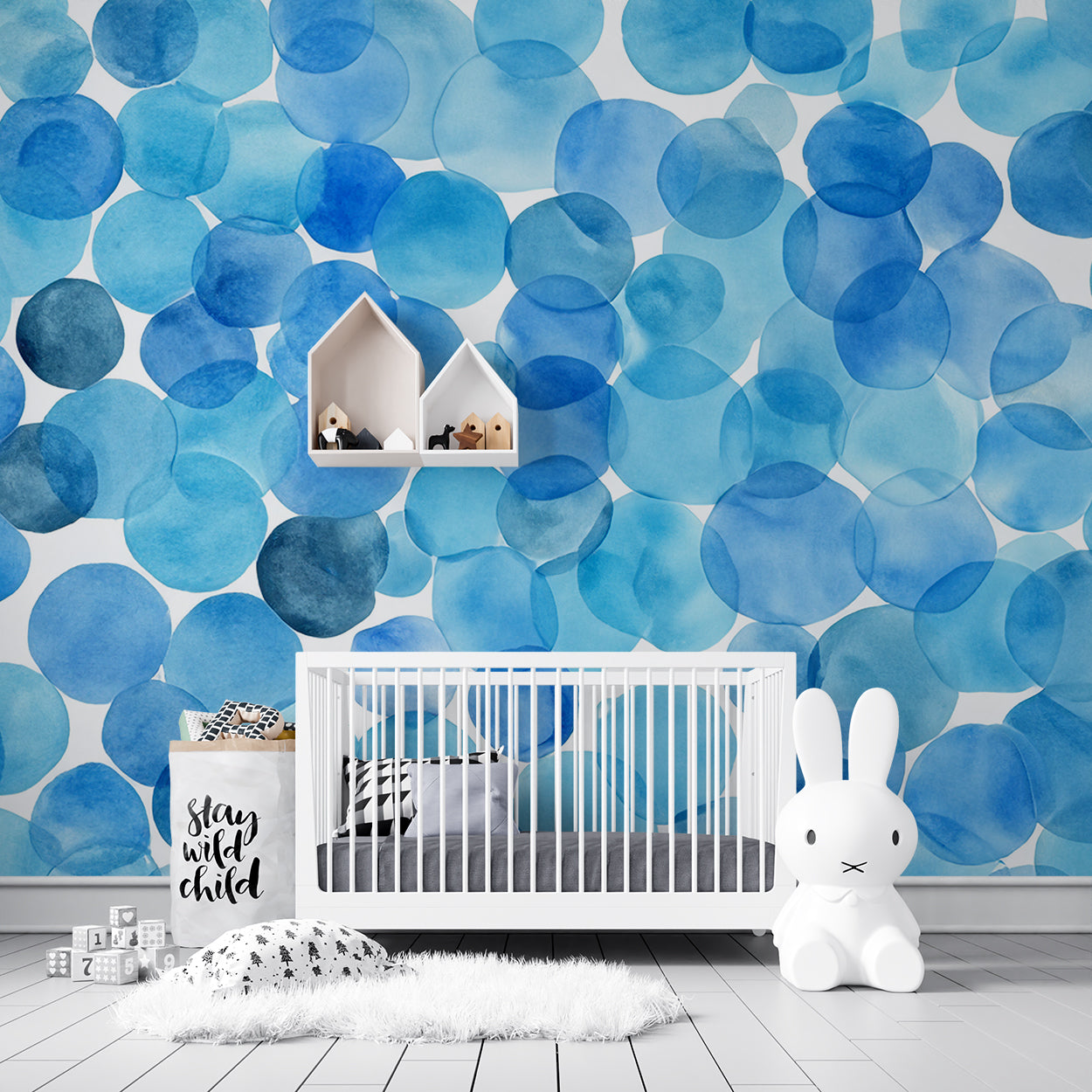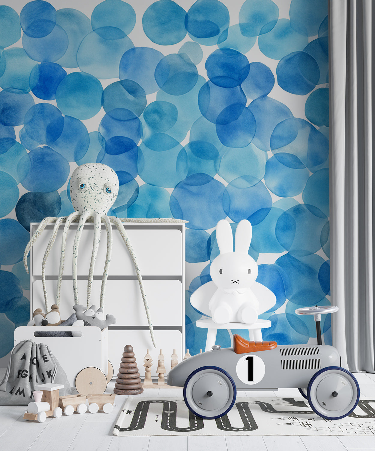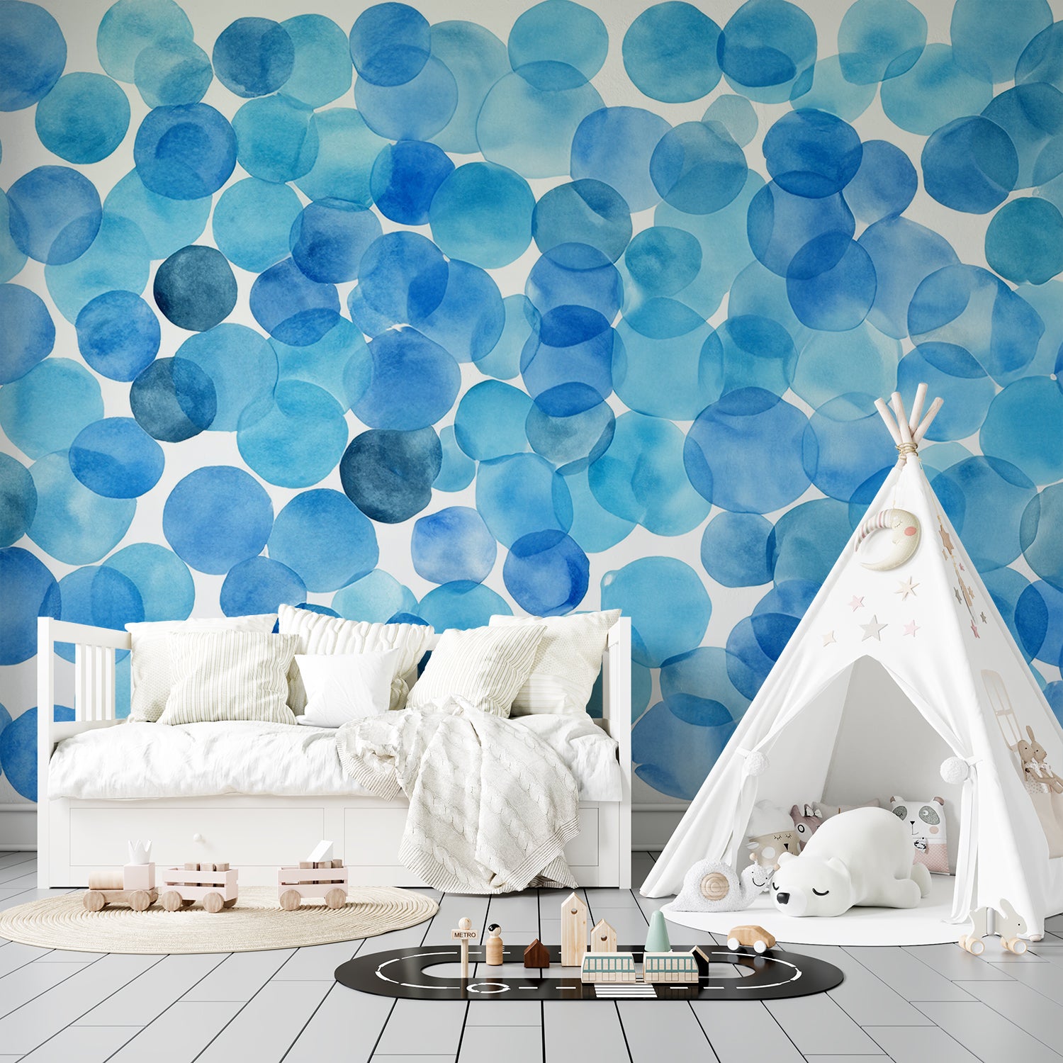 Dit levendige ontwerp brengt de energie en rust van de oceaan tot leven met een patroon van aquarelblauwe cirkels die lijken op luchtbellen in het water. De transparante en overlappende tinten variëren van licht tot diepblauw, waardoor een speels en dynamisch effect ontstaat. Dit luchtige en moderne design voegt een frisse, maritieme sfeer toe aan elke ruimte en brengt het gevoel van vrijheid en beweging met zich mee.