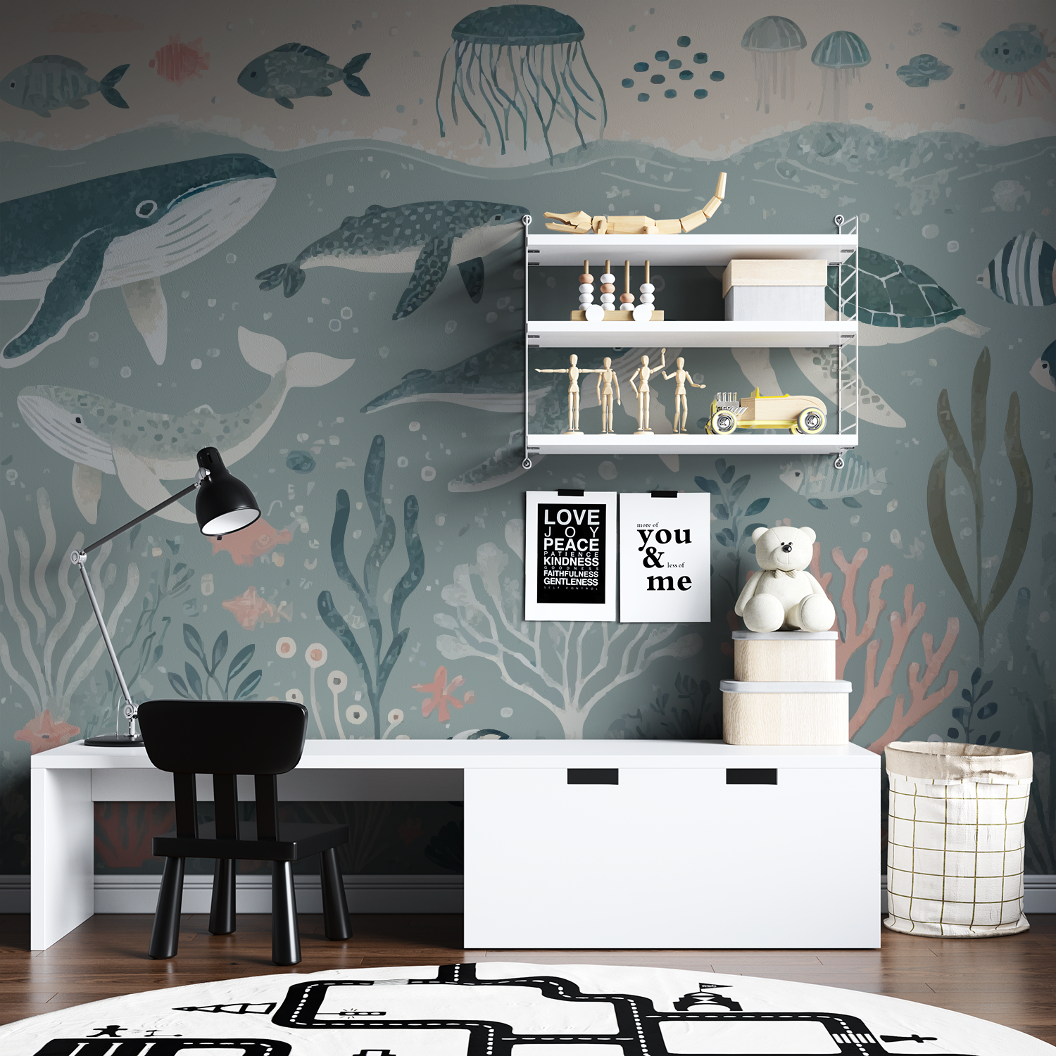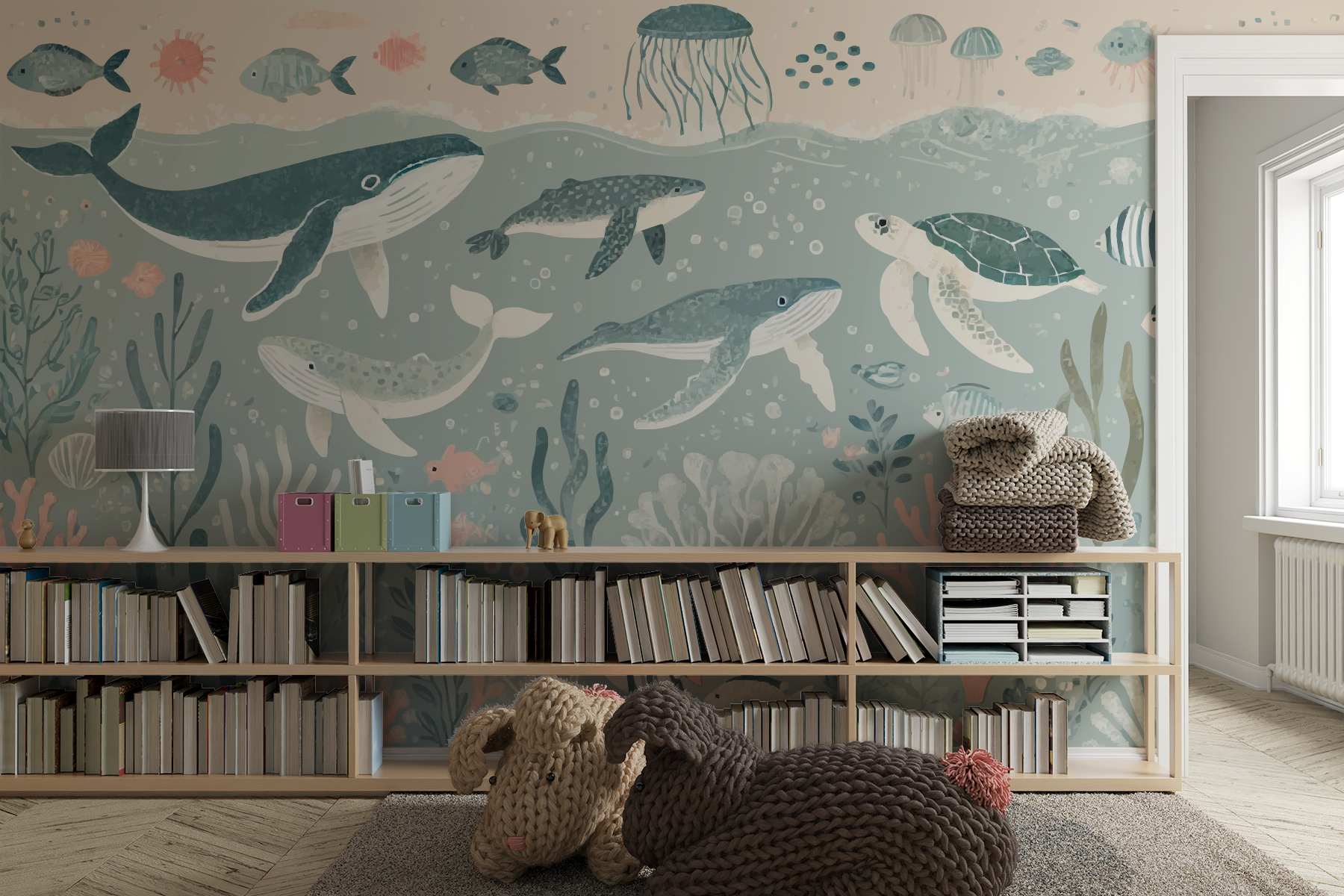 Betreed een wereld van onderwatermagie met "Ocean Dreams". Dit betoverende kunstwerk toont een speels oceaantafereel met zeedieren zoals walvissen, zeeschildpadden, kleurrijke vissen en koraalriffen. De zachte kleuren en illustratieve stijl creëren een rustgevende en dromerige sfeer. Perfect voor kinderkamers of elke ruimte die een vleugje serene schoonheid kan gebruiken. Dit kunstige fotobehang is klaar om een gevoel van rust en verwondering te brengen in uw interieur.