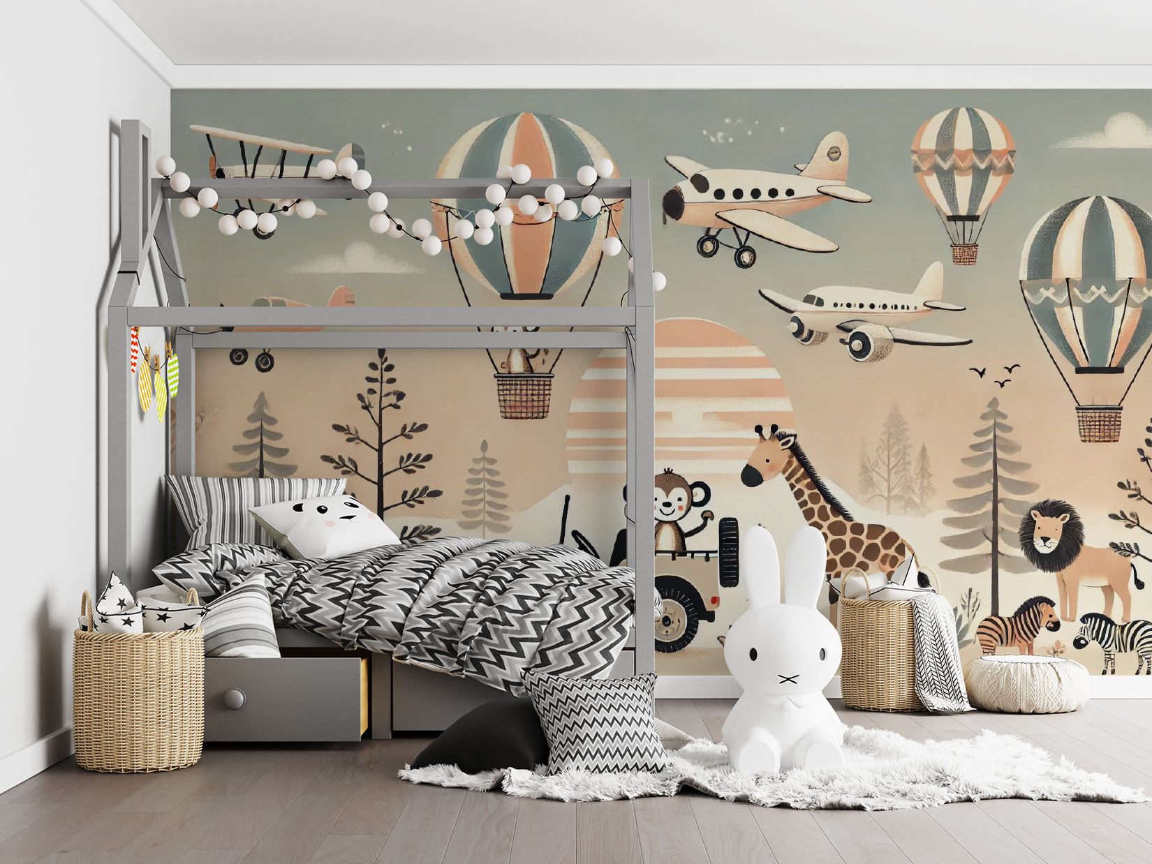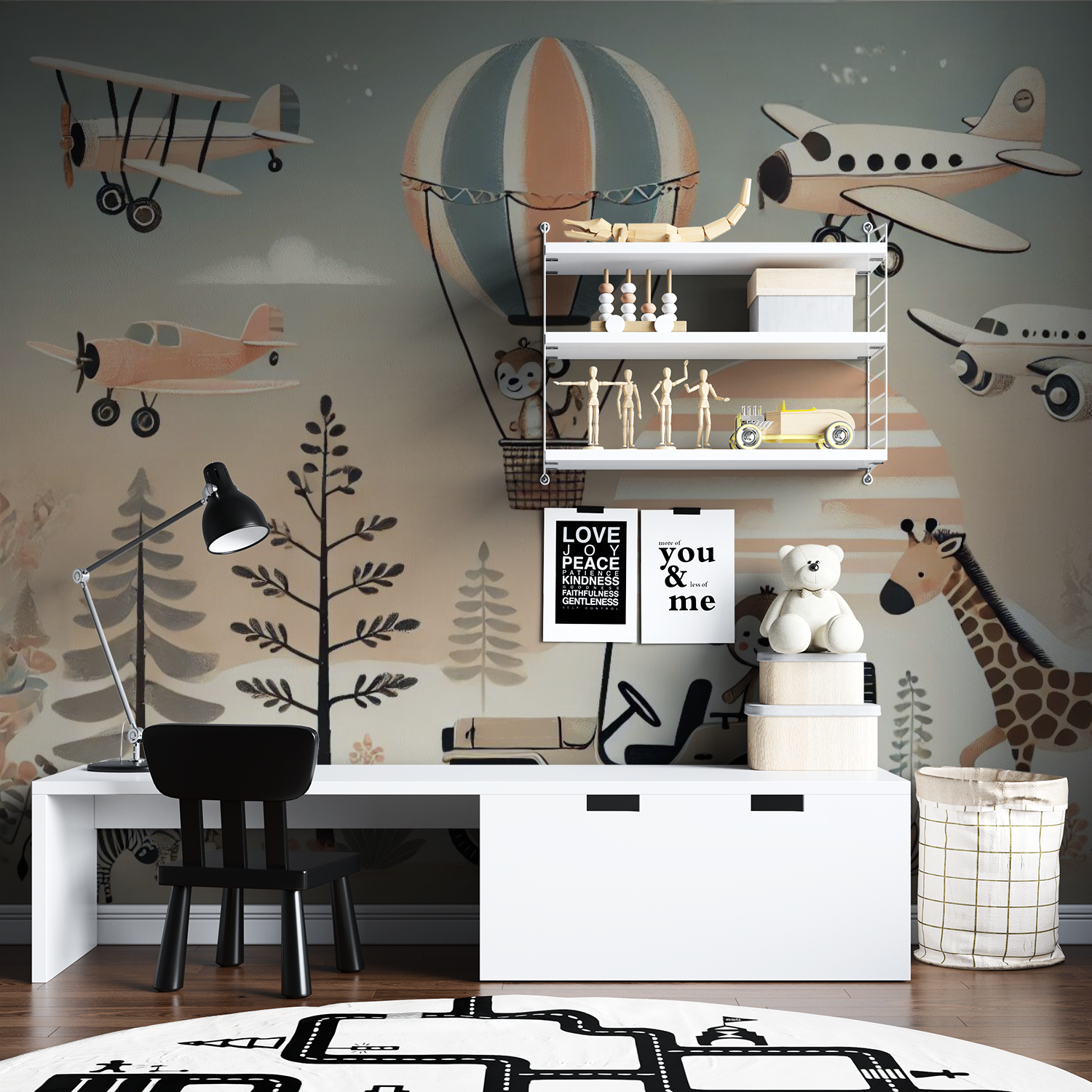 Ervaar de betovering van "Safari Skies". Dit kunstwerk toont een avontuurlijke safariscène met luchtballonnen gevuld met dieren, vliegtuigen, giraffen, zebra's en een jeep met een vrolijke aap. De zachte kleuren en speelse illustraties creëren een gevoel van vreugde en ontdekking, perfect voor kinderkamers of elke ruimte die een avontuurlijke en vreugdevolle touch kan gebruiken. Geprint op hoogwaardig fotobehang, is dit kunstwerk klaar om aan de muur te hangen en een glimlach op het gezicht van iedereen te toveren.