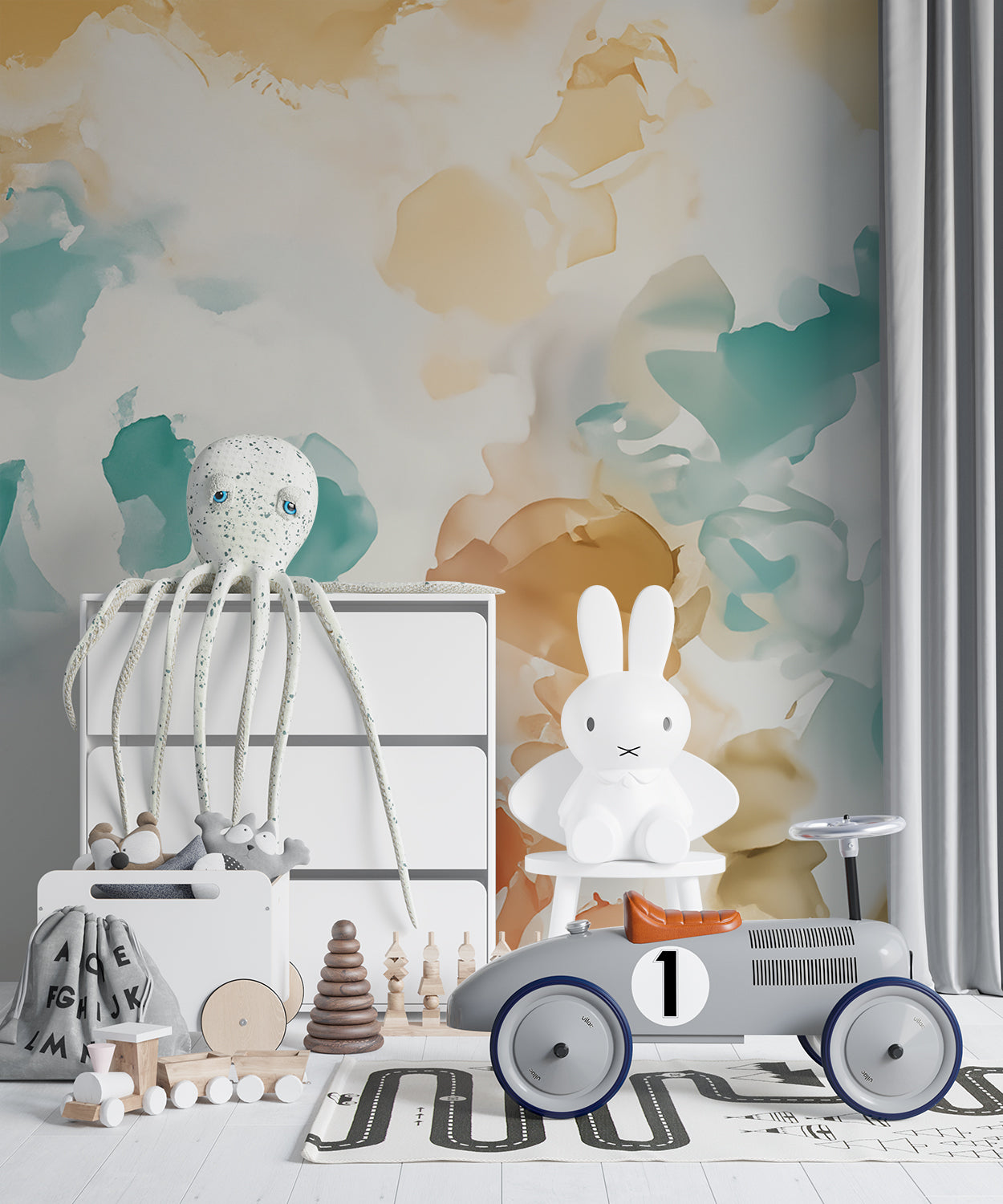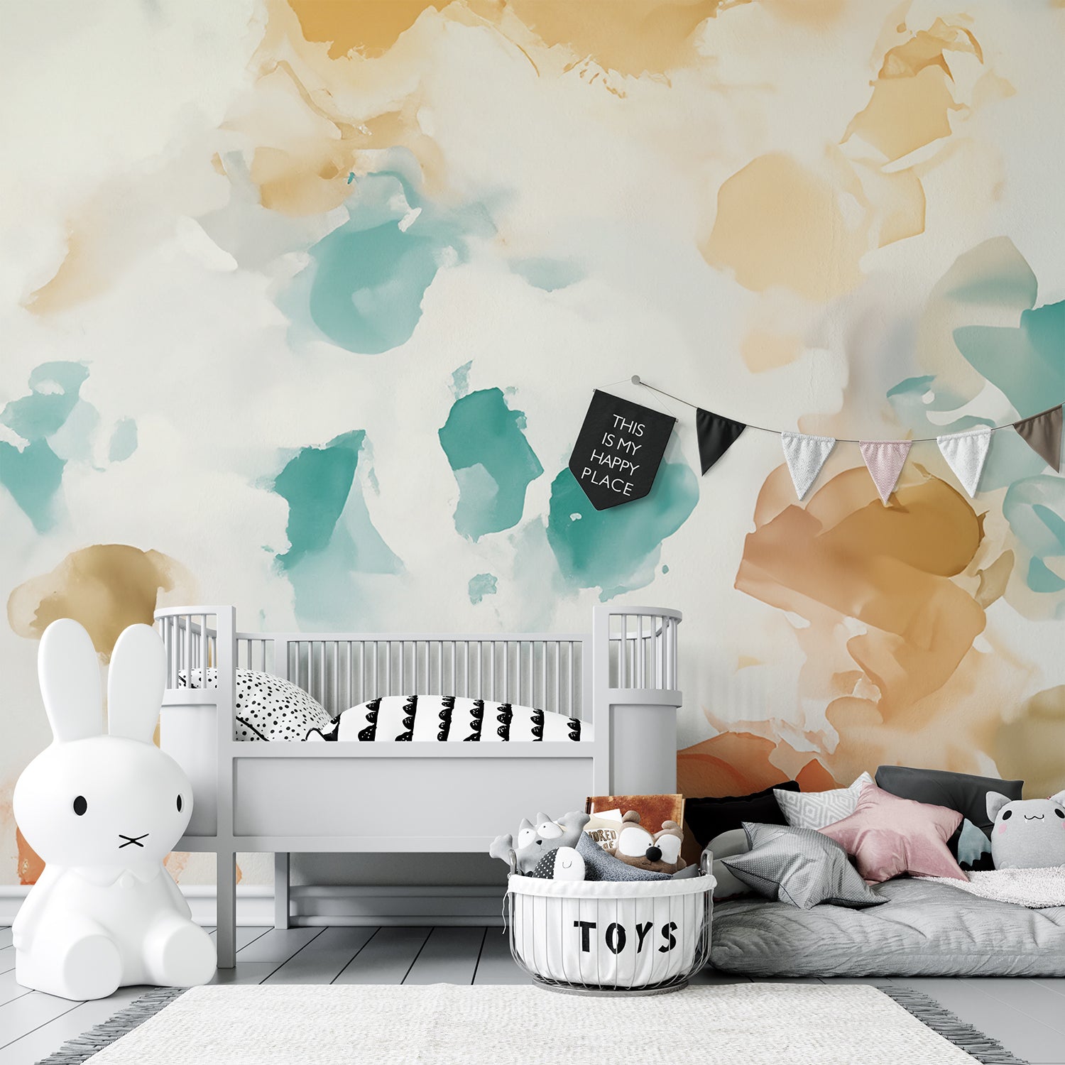 Dit abstracte ontwerp straalt een rustige balans uit met zachte kleurvlakken in tinten van turquoise, zand en terracotta. De vloeiende vormen en luchtige compositie creëren een speelse en toch harmonieuze sfeer, perfect om elke ruimte een verfijnde en moderne uitstraling te geven. Een subtiel kunstwerk dat inspireert en rust brengt.