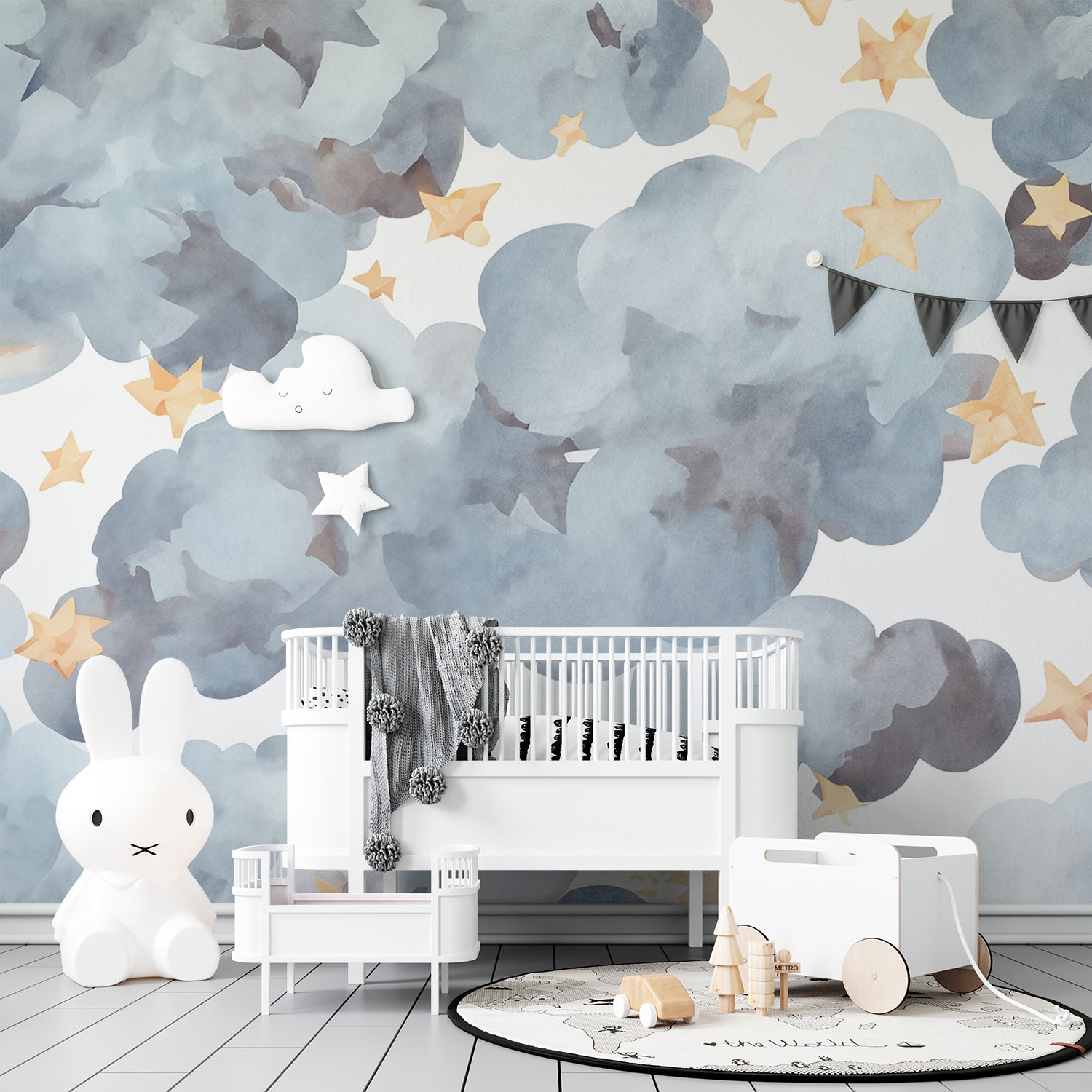 Dit dromerige ontwerp combineert zachte grijstinten van aquarelwolken met warme, gouden sterren die subtiel door de hemel schitteren. De wolken creëren een sfeervol en rustgevend patroon, terwijl de sterren voor een vleugje magie zorgen. Dit delicate design roept een kalme, nachtelijke ambiance op en is perfect voor het creëren van een serene, fantasievolle ruimte. De aquarelstijl geeft een speels, luchtig effect dat zowel tijdloos als elegant is.