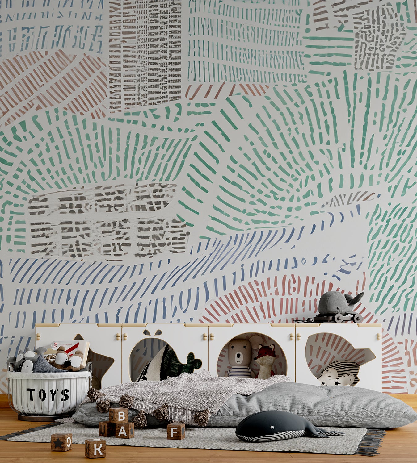 "Textured Tapestry" combineert speelse geometrische patronen met subtiele, handgetekende lijnen in een verfijnd palet van pastel- en aardetinten. Het ontwerp straalt een modern-artistieke sfeer uit en brengt beweging en diepte in elk interieur. De organische vormen en het lineaire patroon zorgen voor een dynamisch en levendig effect, ideaal voor ruimtes die een frisse en creatieve uitstraling nodig hebben.