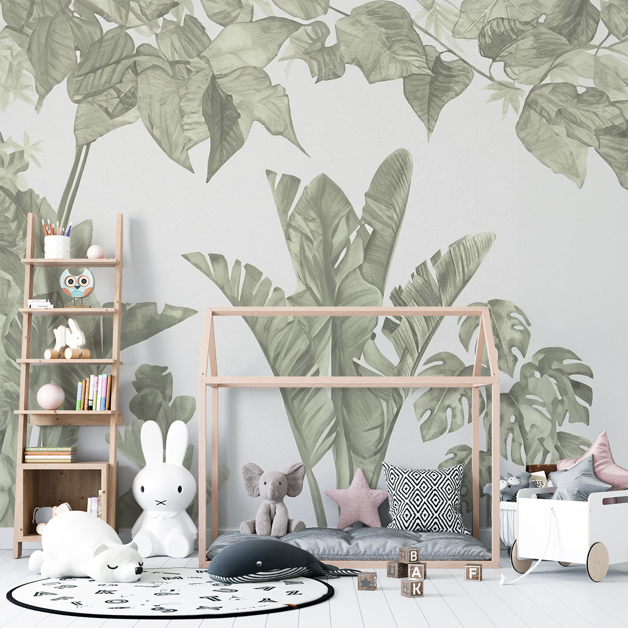 Dit serene tropische ontwerp brengt de rust en frisheid van de jungle naar je interieur. Met subtiele groene tinten en gedetailleerde bladeren, creëert het een weelderige sfeer van natuurlijke elegantie. De harmonie tussen de bladeren zorgt voor een luchtige, organische uitstraling die perfect is voor het creëren van een ontspannen, botanische ruimte. Het ontwerp voelt licht en verfijnd aan, en nodigt uit om je volledig onder te dompelen in de rustgevende schoonheid van de natuur.
