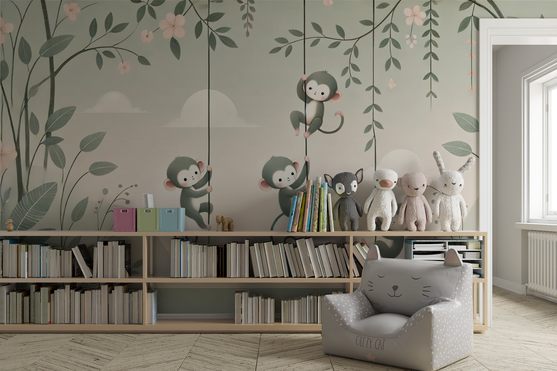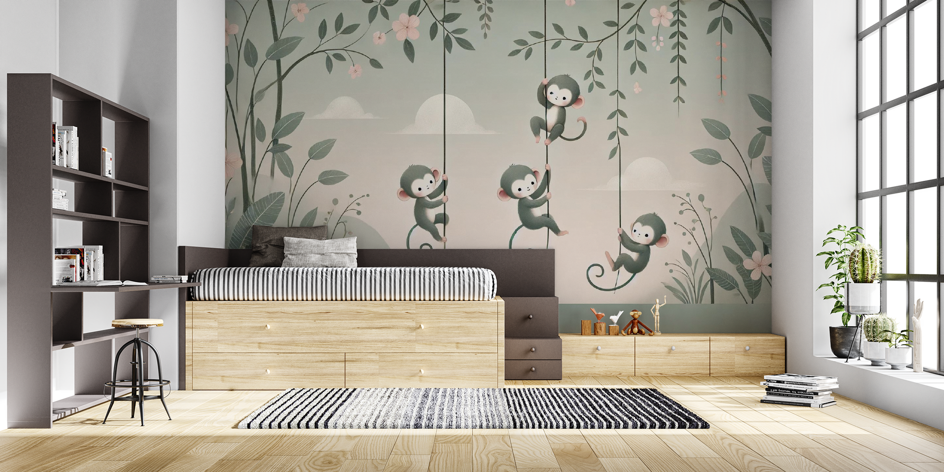 "Vine Swinging Fun" is een betoverend kunstwerk dat een groep schattige aapjes toont die vrolijk aan lianen slingeren. Dit serene en minimalistische kunstwerk heeft een zachte, pastelkleurige achtergrond, wat een kalmerend effect geeft. De aapjes, met hun speelse uitdrukkingen en levendige details, brengen een gevoel van vreugde en avontuur over. Ideaal om een speelse en rustgevende sfeer toe te voegen aan elke kinderkamer, terwijl het de verbeelding van kinderen prikkelt en een glimlach op hun gezicht tovert.