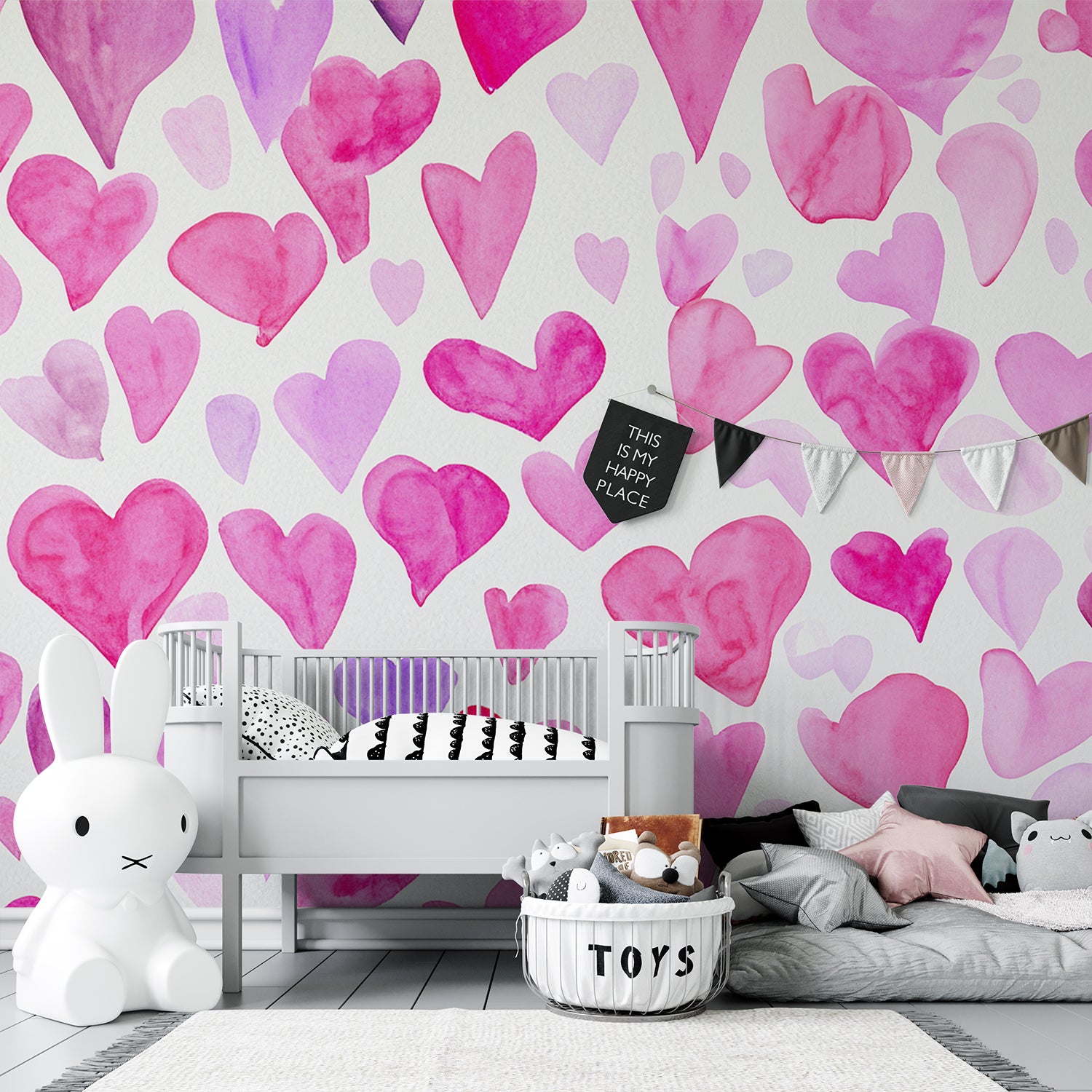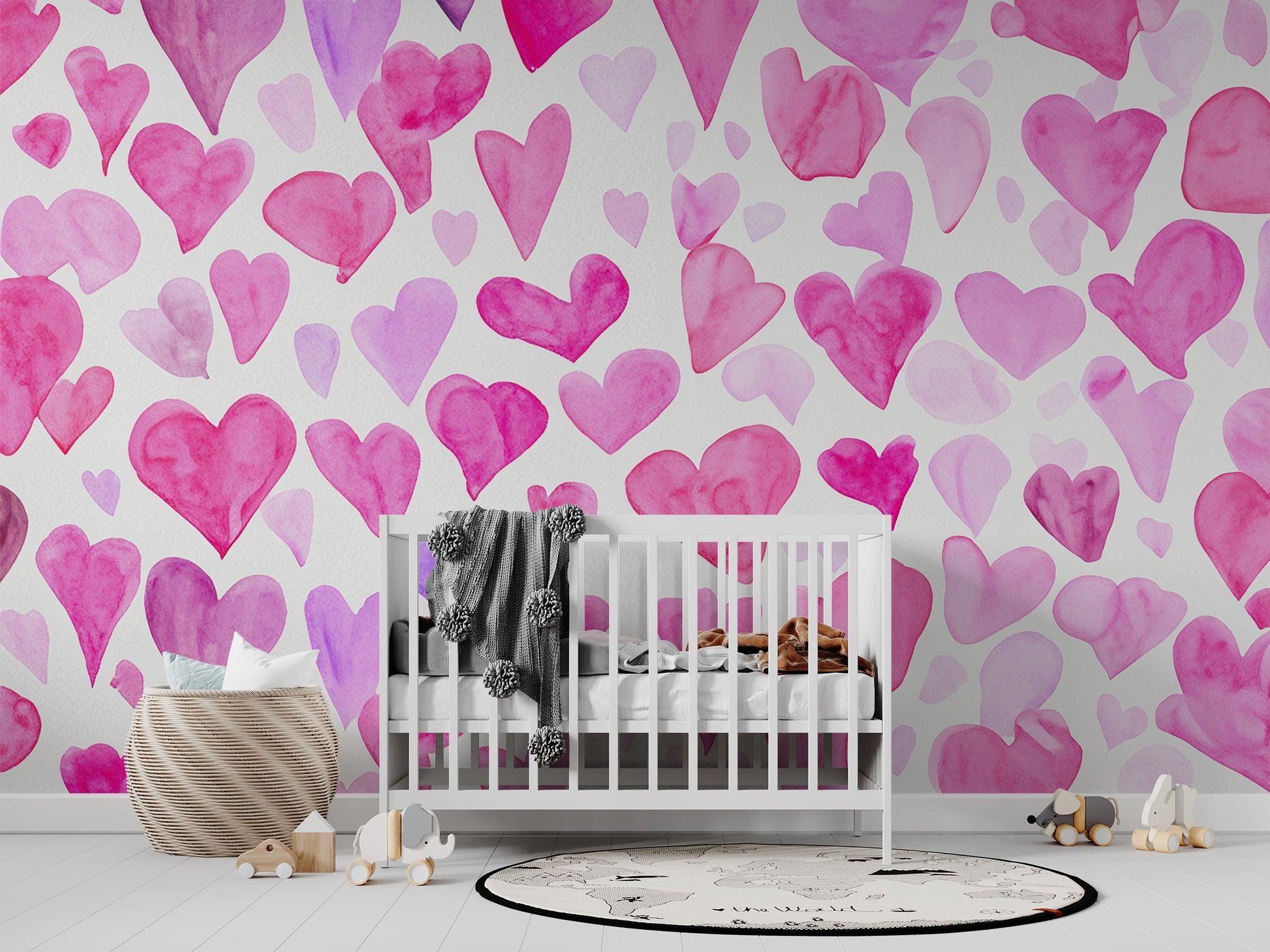 Deze speelse aquarelcompositie van hartvormen in tinten roze, paars en rood brengt warmte en liefde in elke ruimte. Het handgeschilderde effect van de harten, variërend in vormen en groottes, creëert een dynamisch en vrolijk patroon. Het zachte kleurverloop en de luchtige, speelse opzet maken dit ontwerp perfect voor een levendige en liefdevolle sfeer in de kamer.