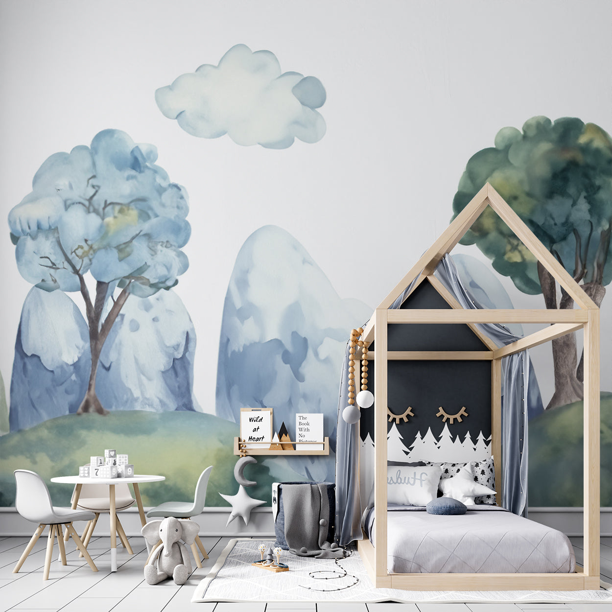 Dit serene ontwerp brengt een sprookjesachtige winterwereld tot leven met zachte, waterverfachtige kleuren. De glooiende heuvels en met sneeuw bedekte bomen zorgen voor een kalme en dromerige sfeer. Het kleurgebruik van pastelblauw en groene tinten, gecombineerd met de delicate vormen van de bomen en bergen, maakt dit design perfect voor een rustgevende ruimte waar natuur en fantasie samenkomen.