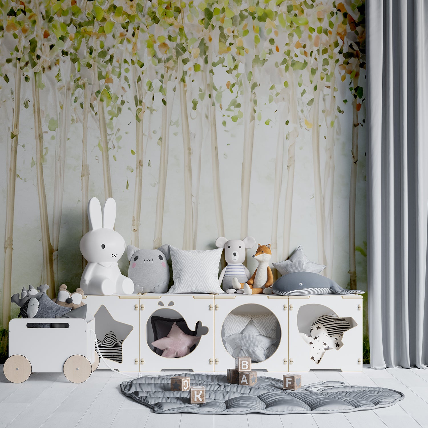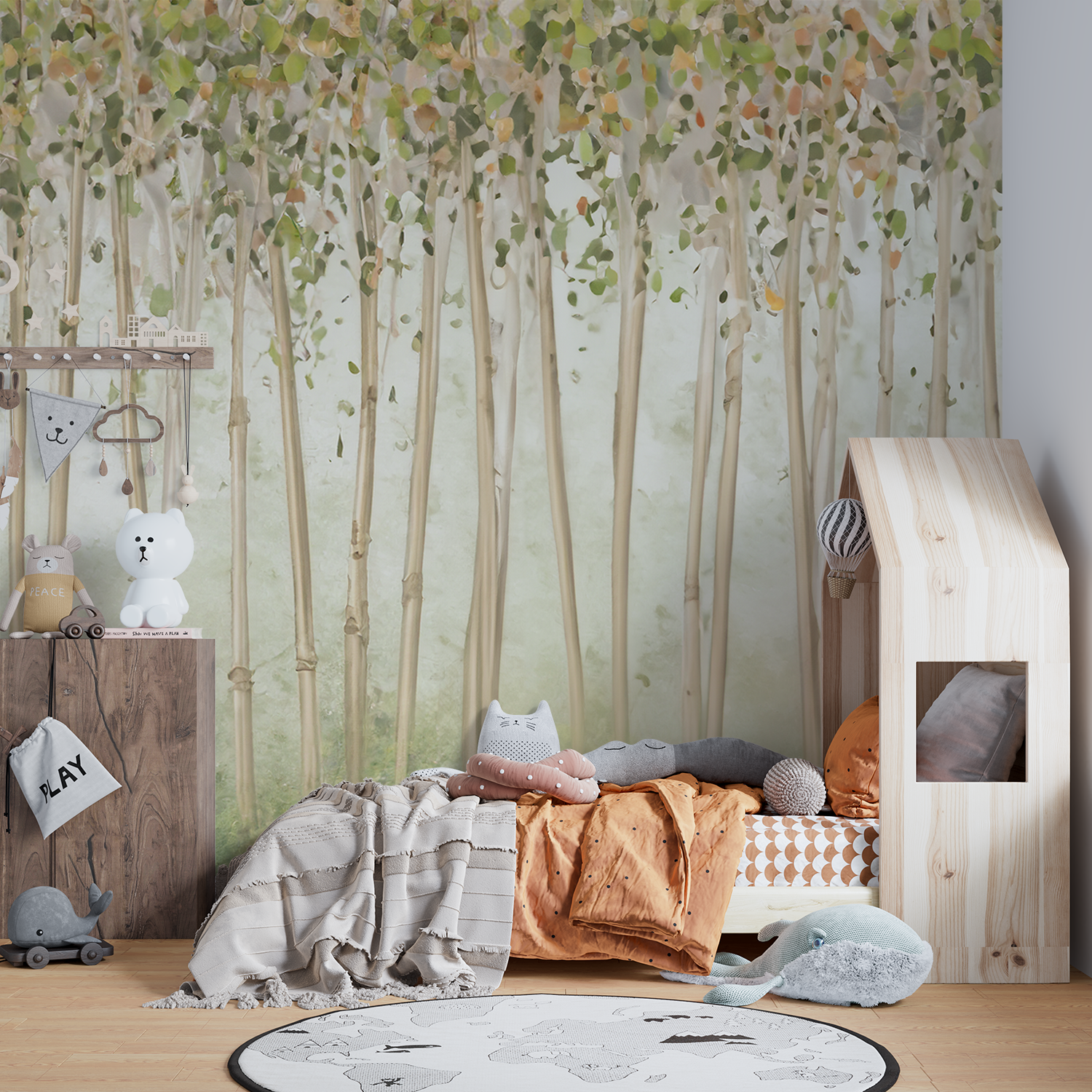 Dit serene ontwerp brengt de rust van een bos direct naar je interieur. De slanke, hoge stammen van de bomen met hun delicate bladeren creëren een dromerig, bijna etherisch effect. Het subtiele kleurenschema, met zachte groentinten en een vleugje herfst, roept een gevoel van ruimte en natuurlijke schoonheid op. Perfect voor een rustgevende, organische sfeer in elke ruimte.