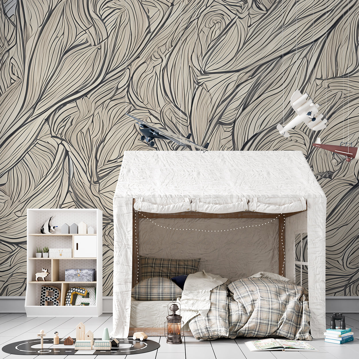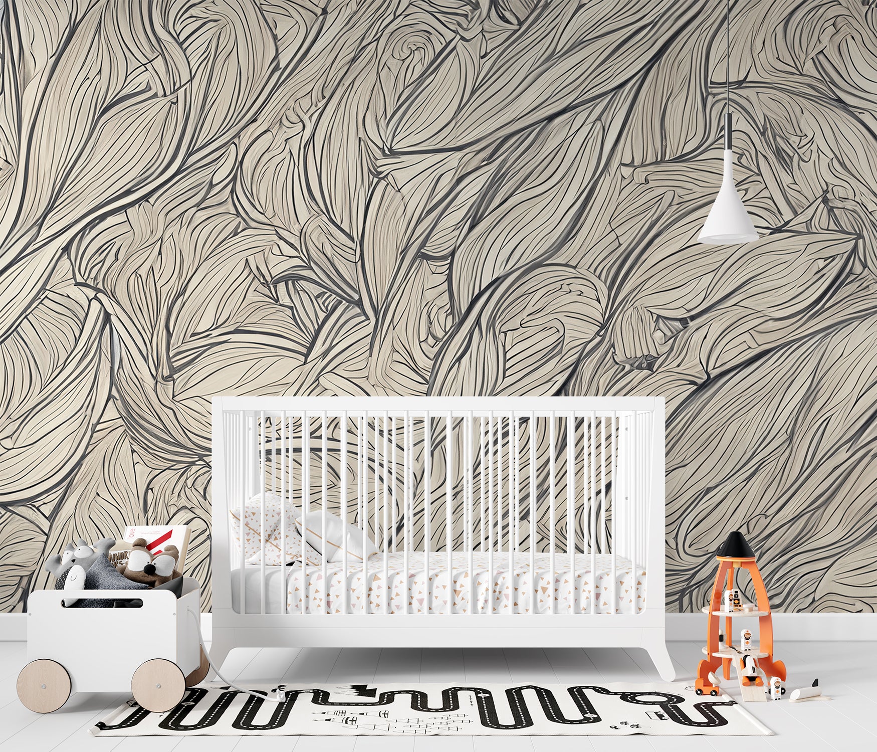 Dit ontwerp met zachte, golvende lijnen roept de natuurlijke beweging van bladeren in de wind op. Het subtiele kleurenschema van beige en crème zorgt voor een rustige, elegante sfeer. De organische patronen geven een gevoel van vloeiende beweging en creëren een harmonieus en tijdloos ontwerp, perfect voor een serene ruimte die rust en verfijning uitstraalt.