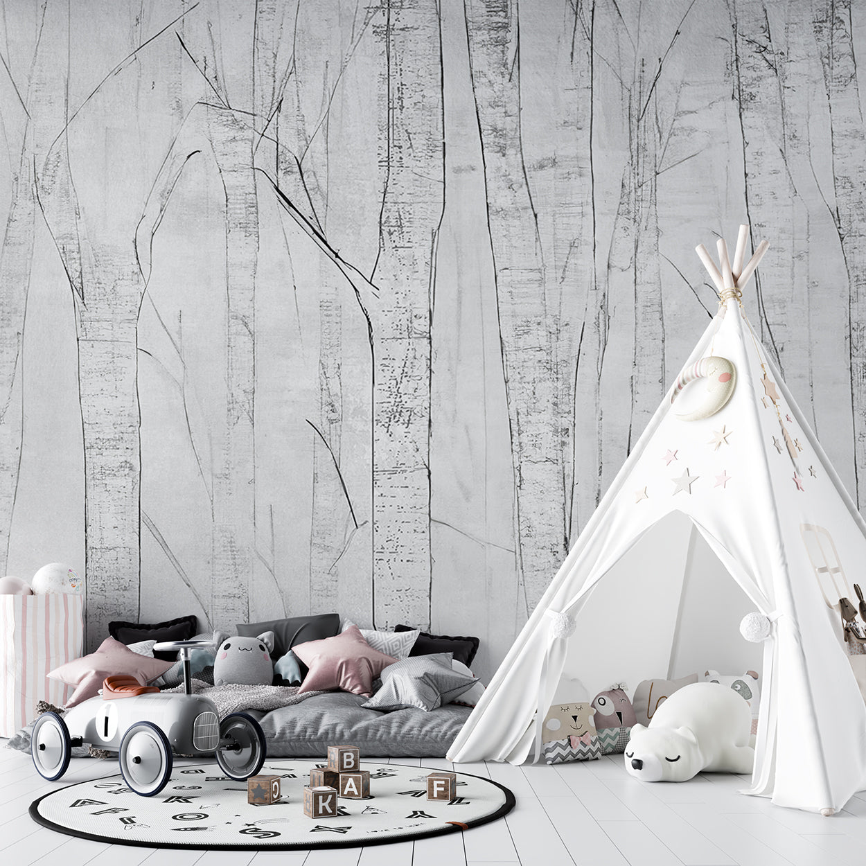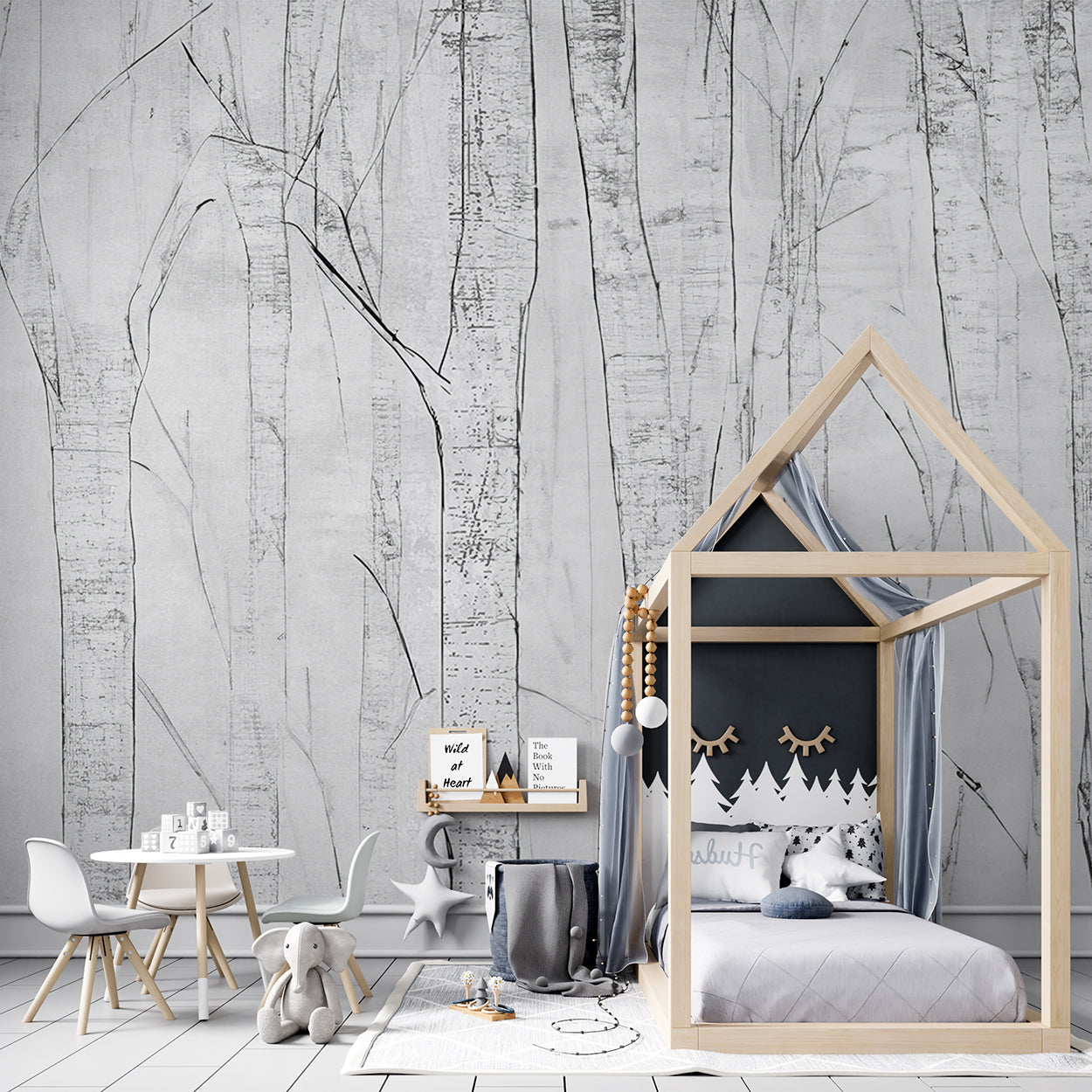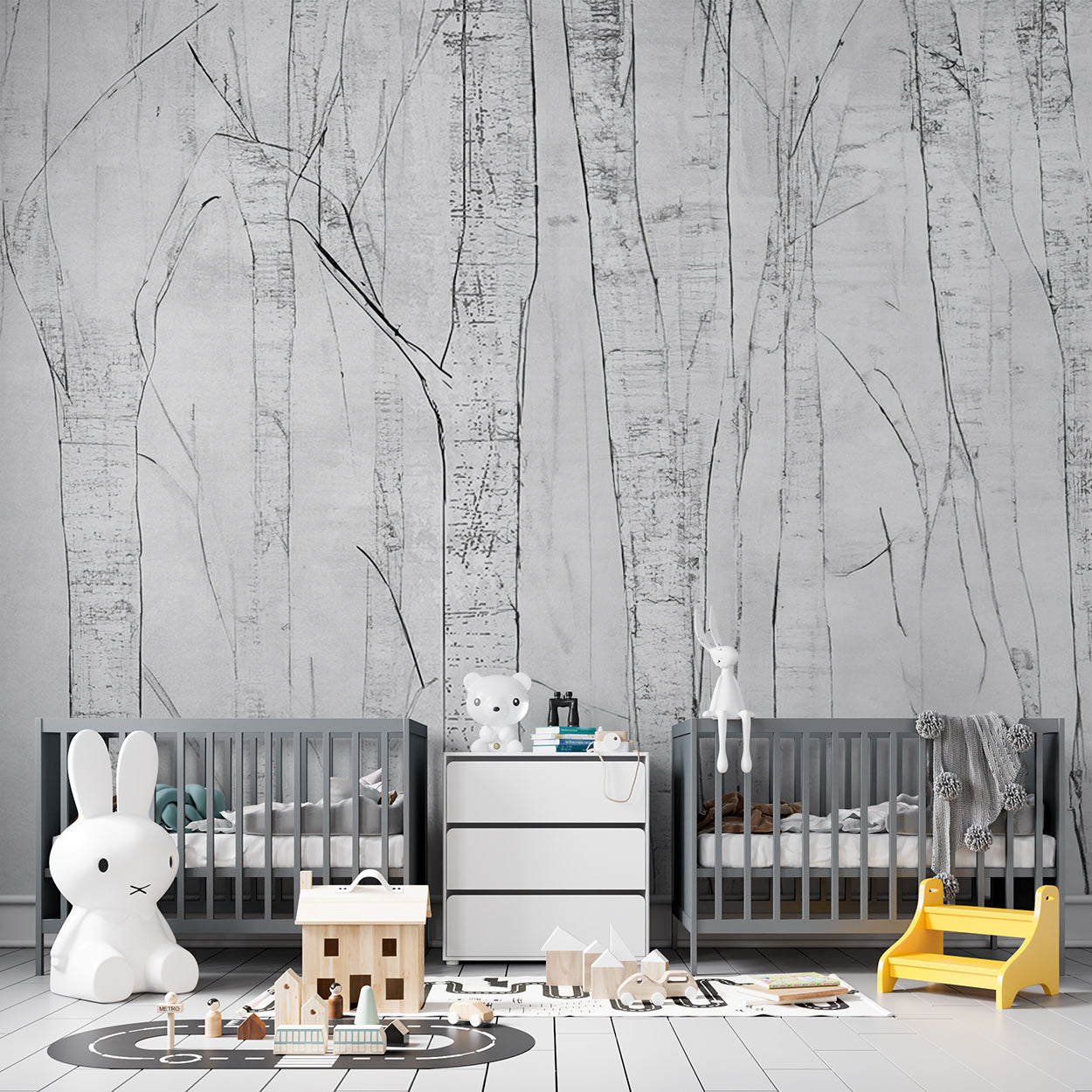 Dit minimalistische ontwerp vangt de subtiele elegantie van een berkenbos in een monochrome stijl. De fijne, gedetailleerde lijnen van de stammen geven het een moderne en serene uitstraling, terwijl de grijstinten een tijdloos en rustgevend gevoel oproepen. Perfect om een kalme en stijlvolle sfeer te creëren in elke ruimte.