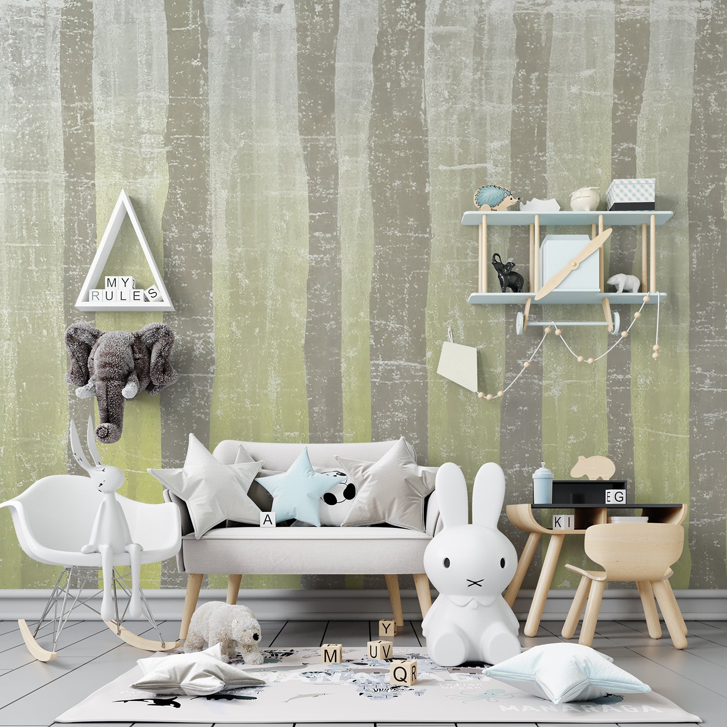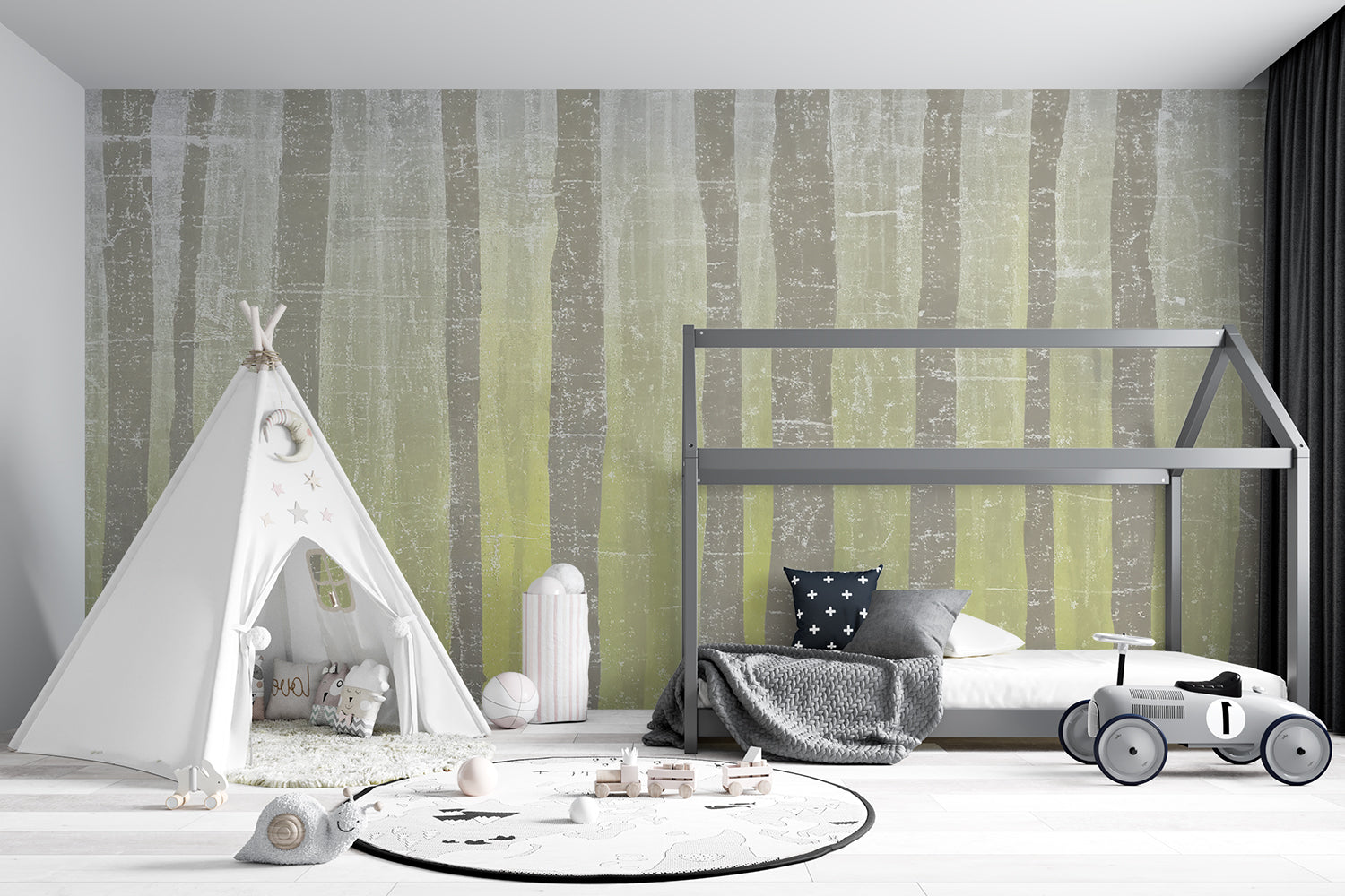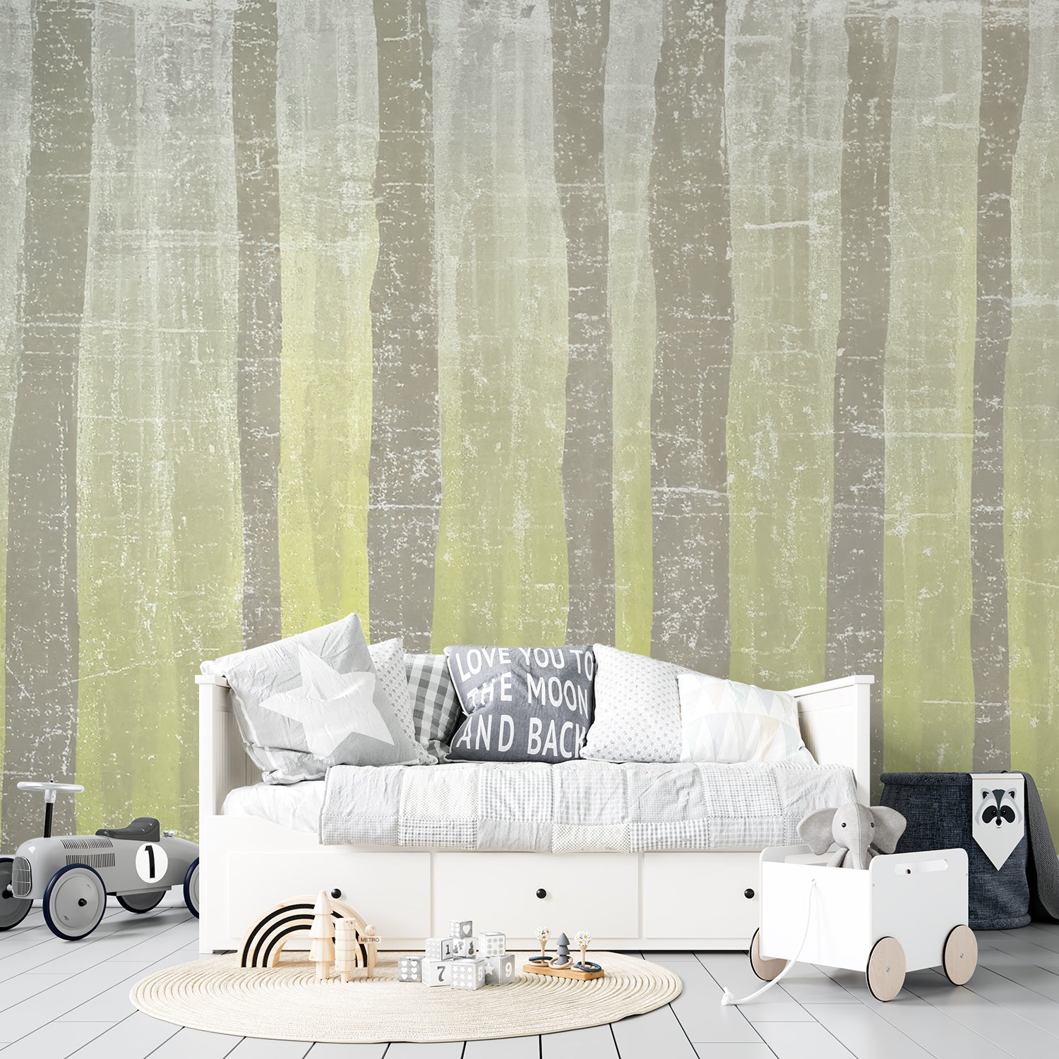 Een subtiele weergave van een mysterieus bos, waar zachte grijze en gele tinten samensmelten tot een kalm en dromerig ontwerp. De verticale lijnen van de bomen creëren een gevoel van hoogte en diepte, terwijl de verweerde textuur het geheel een vintage uitstraling geeft. Perfect voor het toevoegen van een serene en natuurlijke sfeer aan elke ruimte.